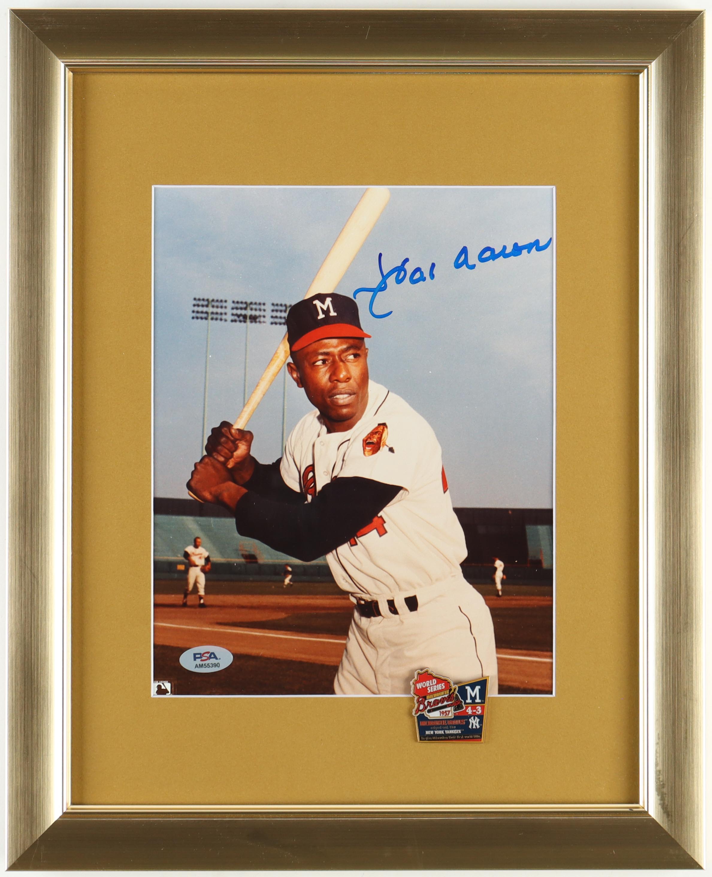 Hank Aaron Signed Braves Custom Framed Photo Display with 1958 Braves World Series Pin (PSA)