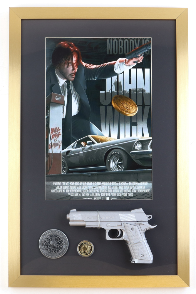 "John Wick" Custom Framed Movie Poster Display with Replica Pistol, Gold Coin & Blood Oath Marker