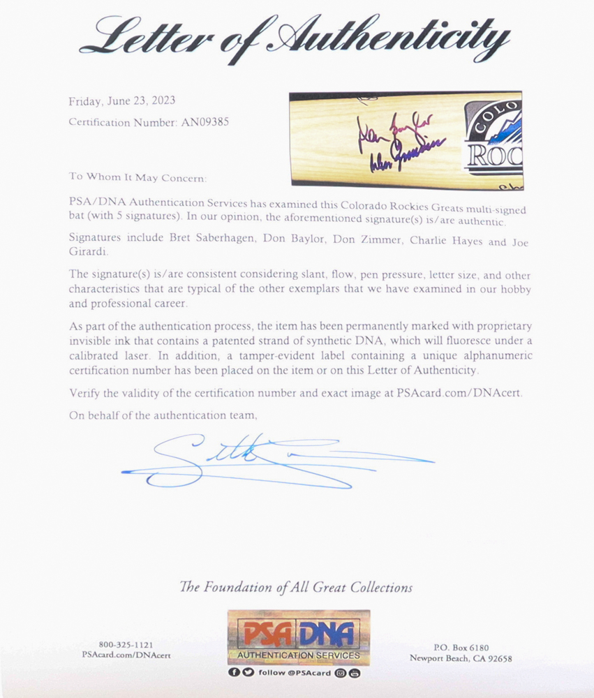 Rockies Greats Cooperstown Commemorative Baseball Bat Signed by (5) with Joe Girardi, Don Baylor, Bret Saberhagen, Don Zimmer, & Charlie Hayes (PSA)