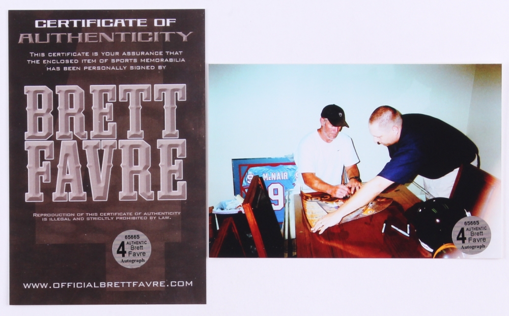 The autograph includes an official Brett Favre hologram and matching COA for authenticity purposes. Also includes a proof picture from the signing.