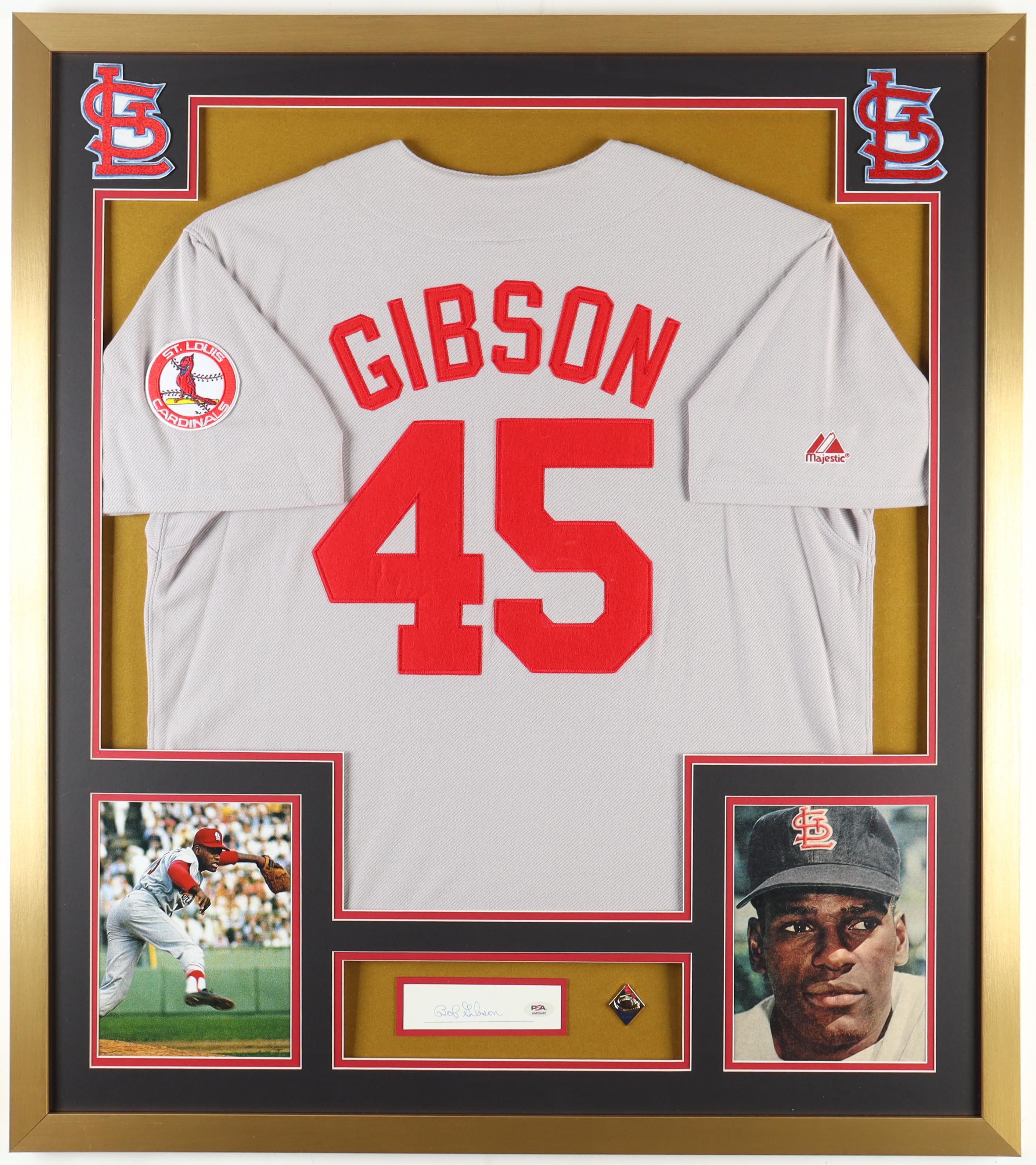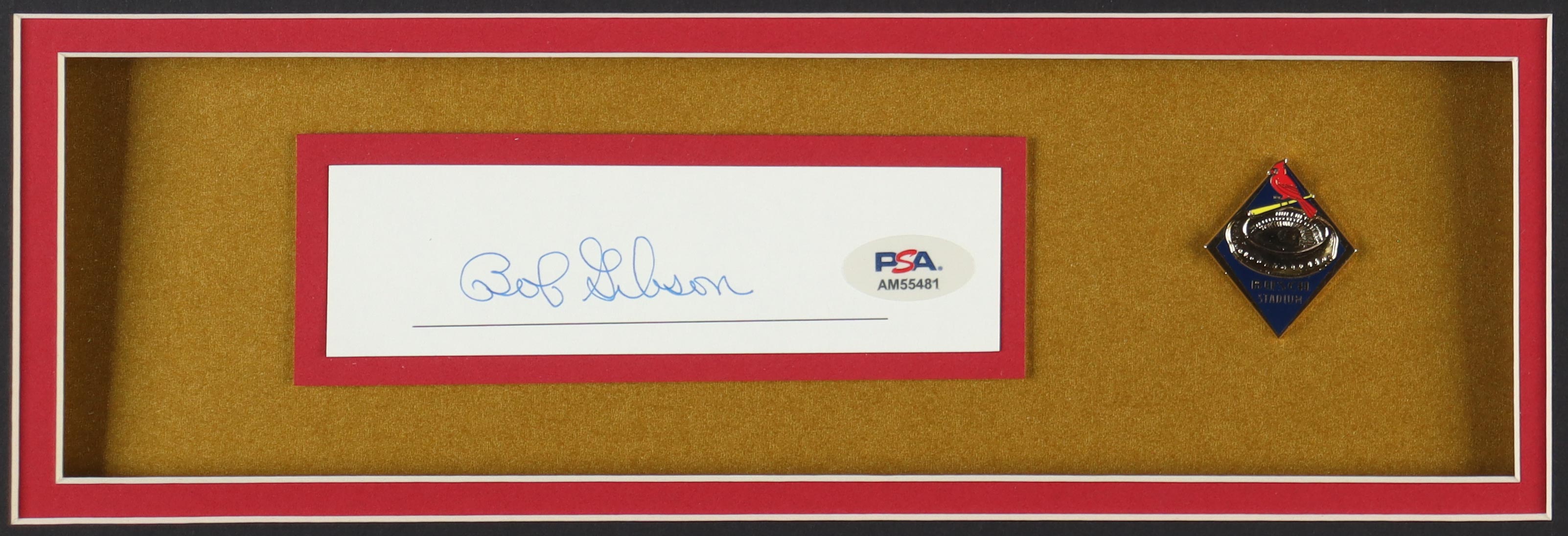 Bob Gibson Signed Custom Framed Cut Display with Jersey With Gold Pin (PSA)