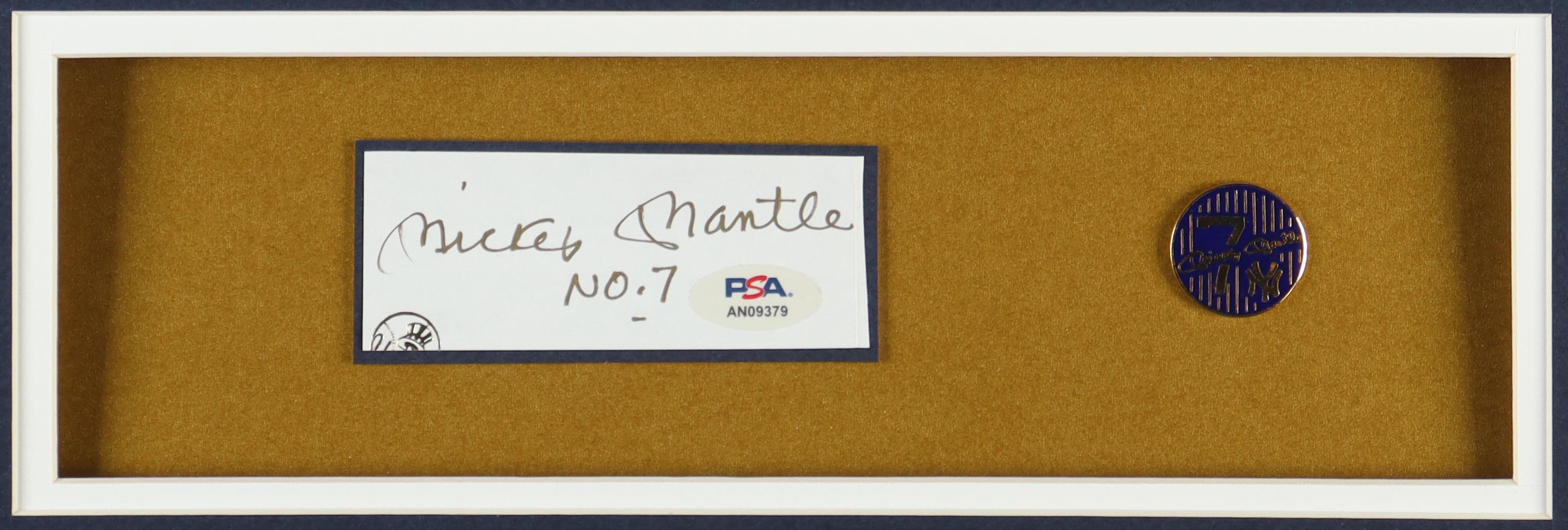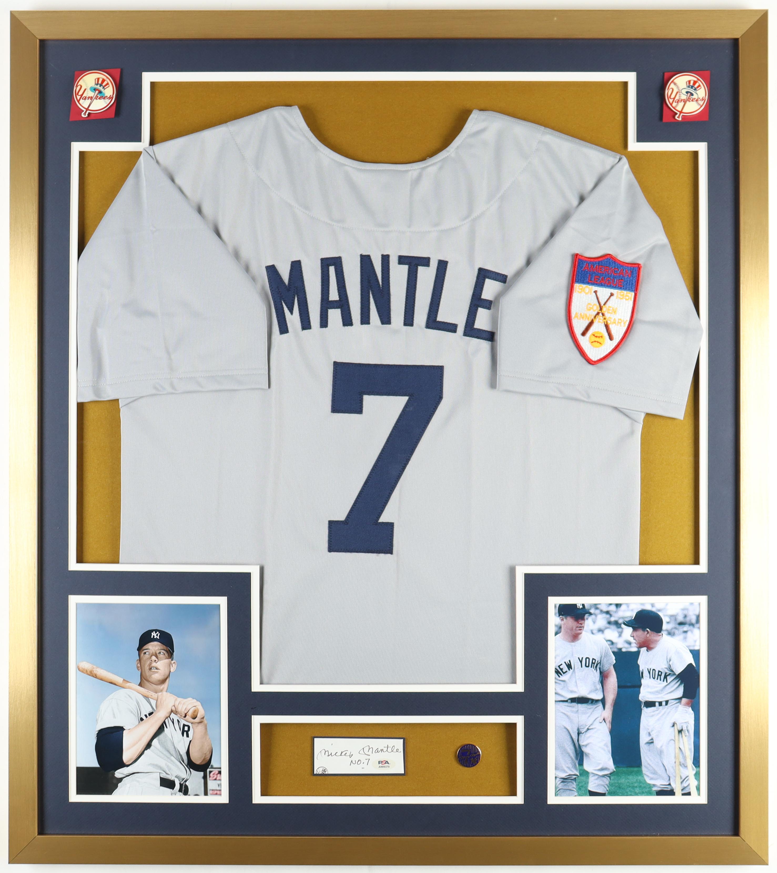Custom frame measures 32" x 36" in size and features a Mickey Mantle jersey as well as a cut that has been hand signed and inscribed by Mickey Mantle (D. 1995, HOF).