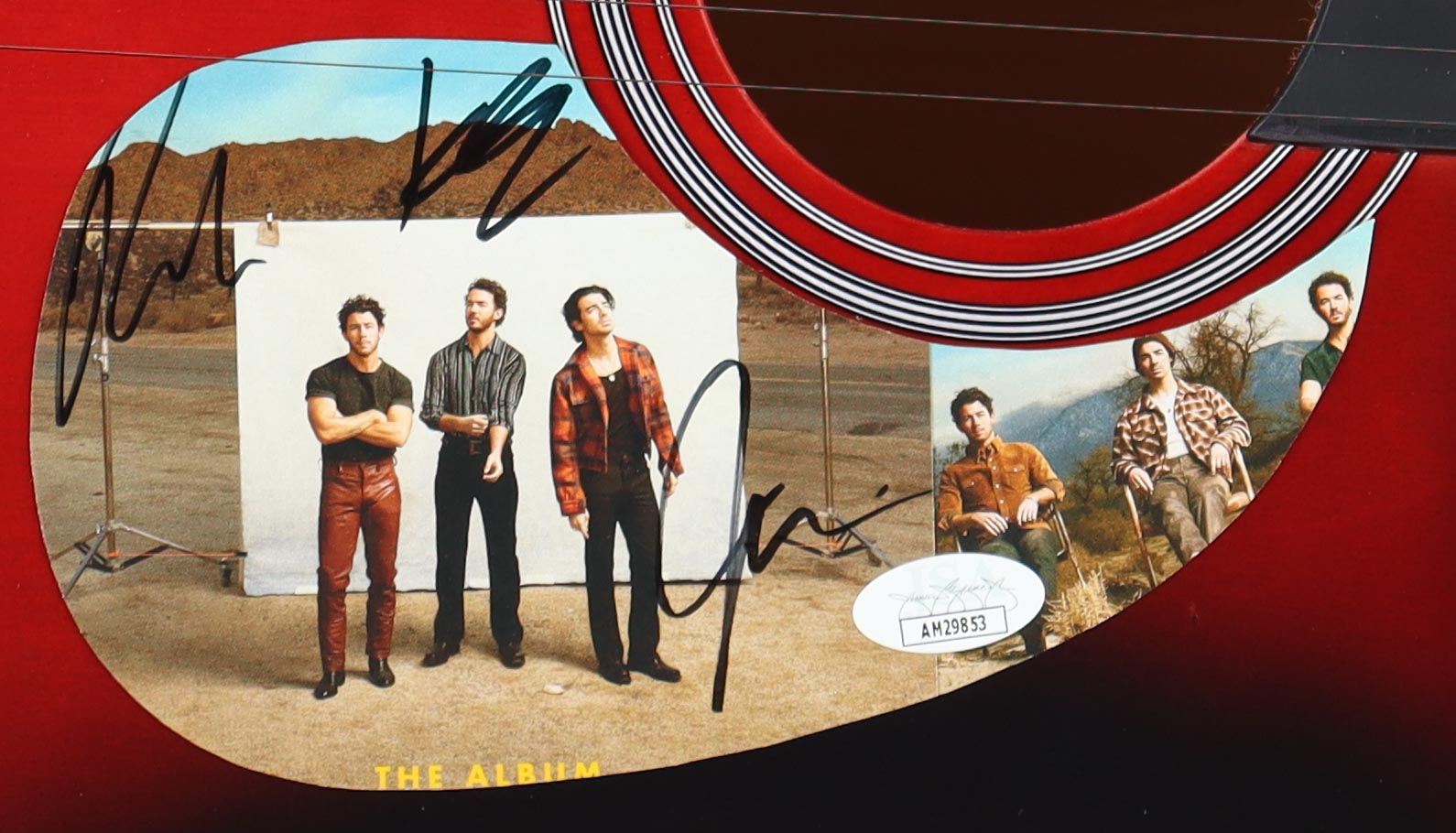 Acoustic guitar measures approximately 38" inches long. Hand-signed on a CD booklet repurposed as a pickguard by Joe Jonas, Nick Jonas and Kevin Jonas.