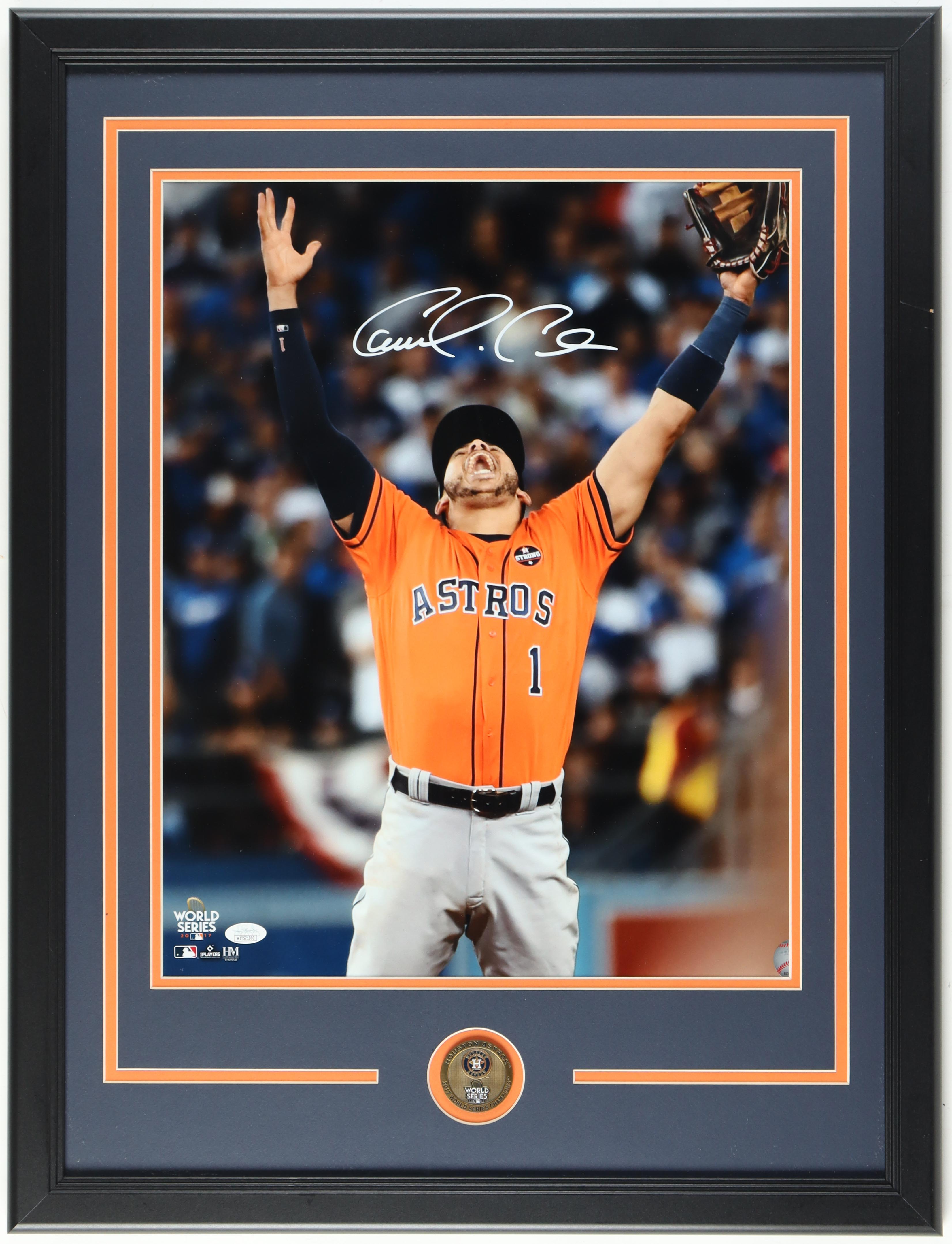 Custom frame measures 22" x 30" in size and features a photo that has been hand-signed by Carlos Correa (Houston Astros). The display also includes a team logo medallion.