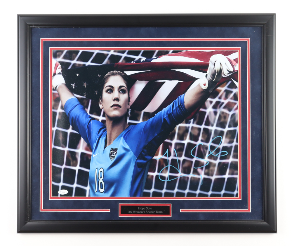 Custom frame measures approximately 23" x 26" in size and features a photo that has been hand-signed by Hope Solo.
