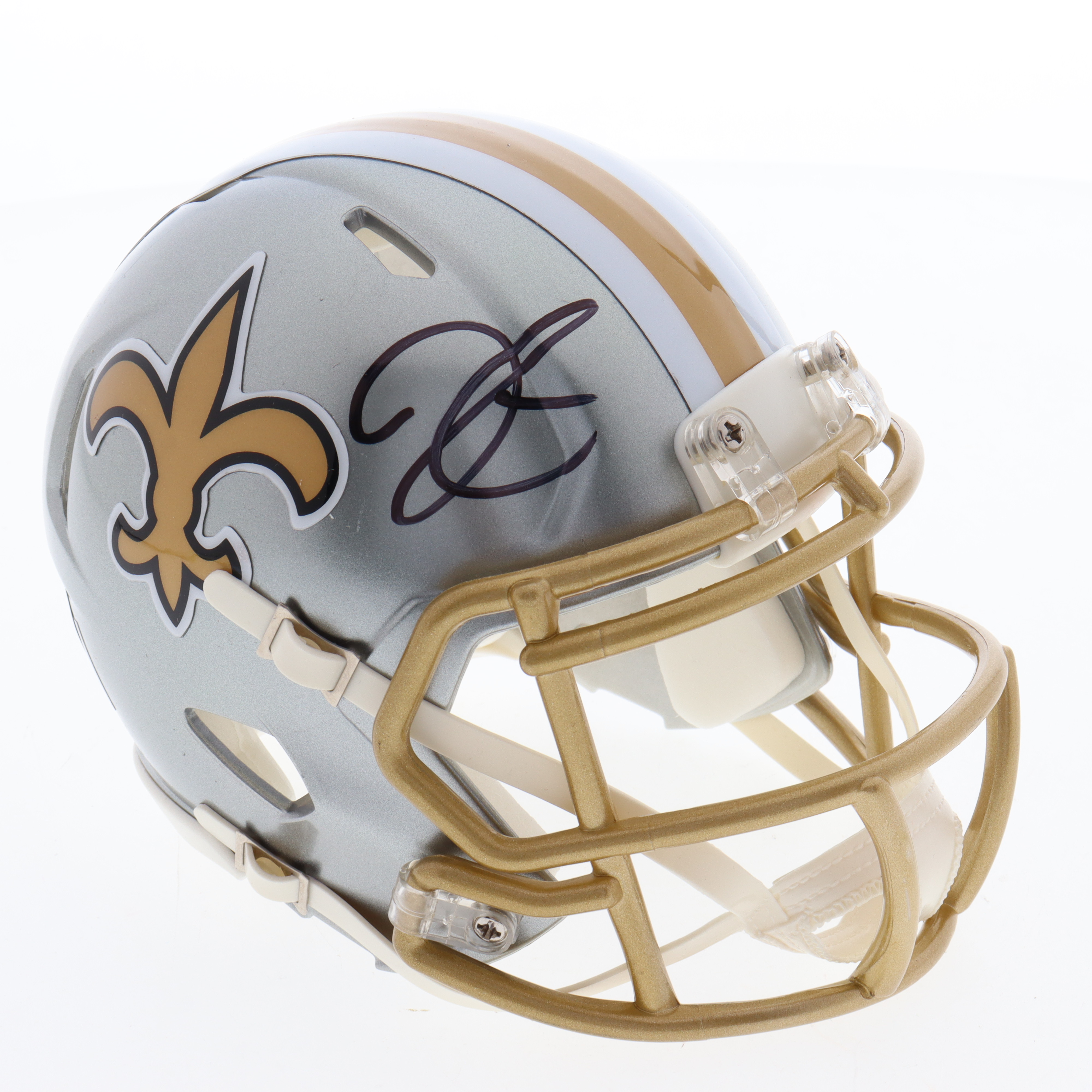 Riddell New Orleans Saints flash alternate speed mini helmet. Hand-signed by Derek Carr.