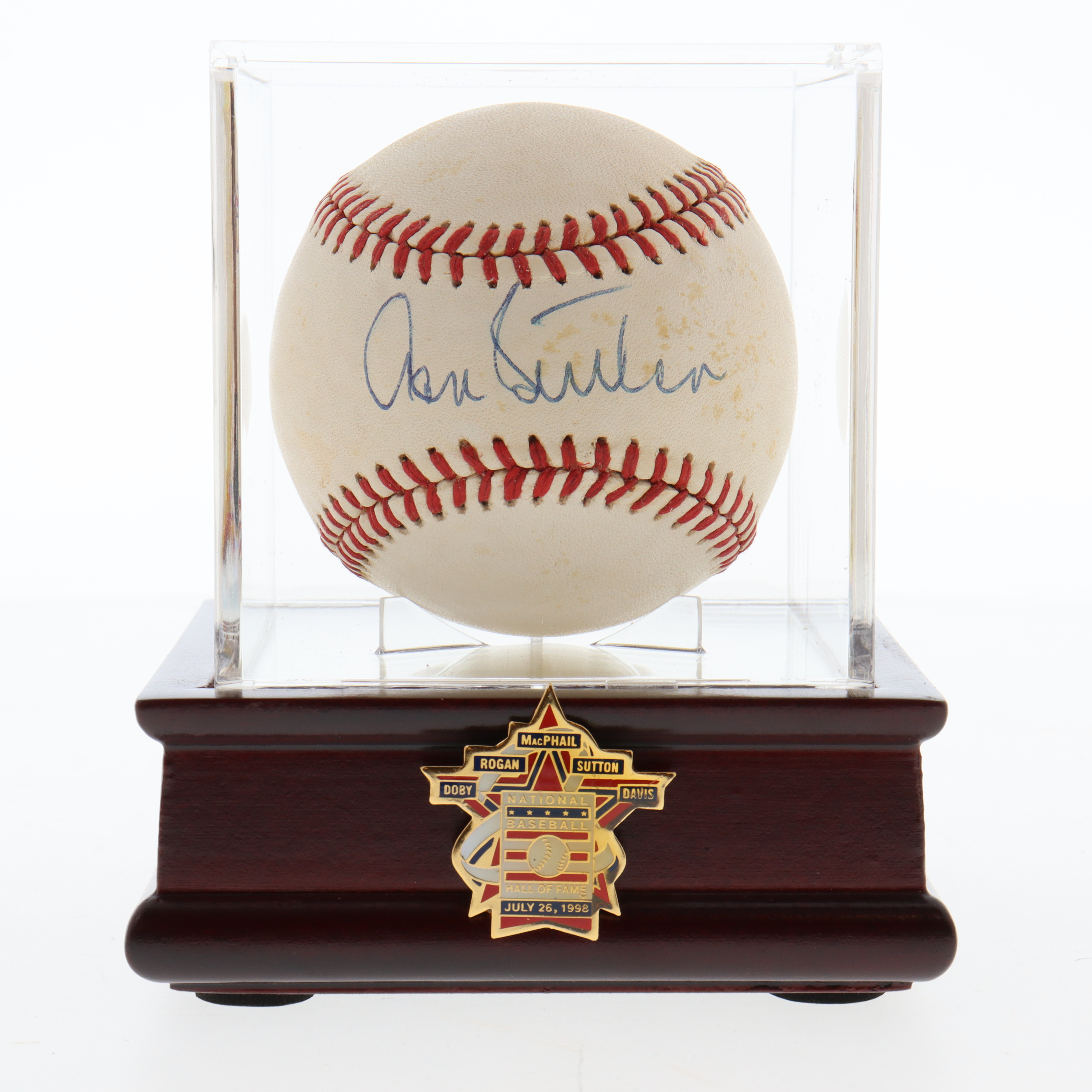 Rawlings Official National League Baseball. Hand-signed by Don Sutton (D. 2021, Los Angeles Dodgers, HOF). Display case is included as shown as well as Hall Of Fame Induction Pin. Please note, the baseball is naturally toned.