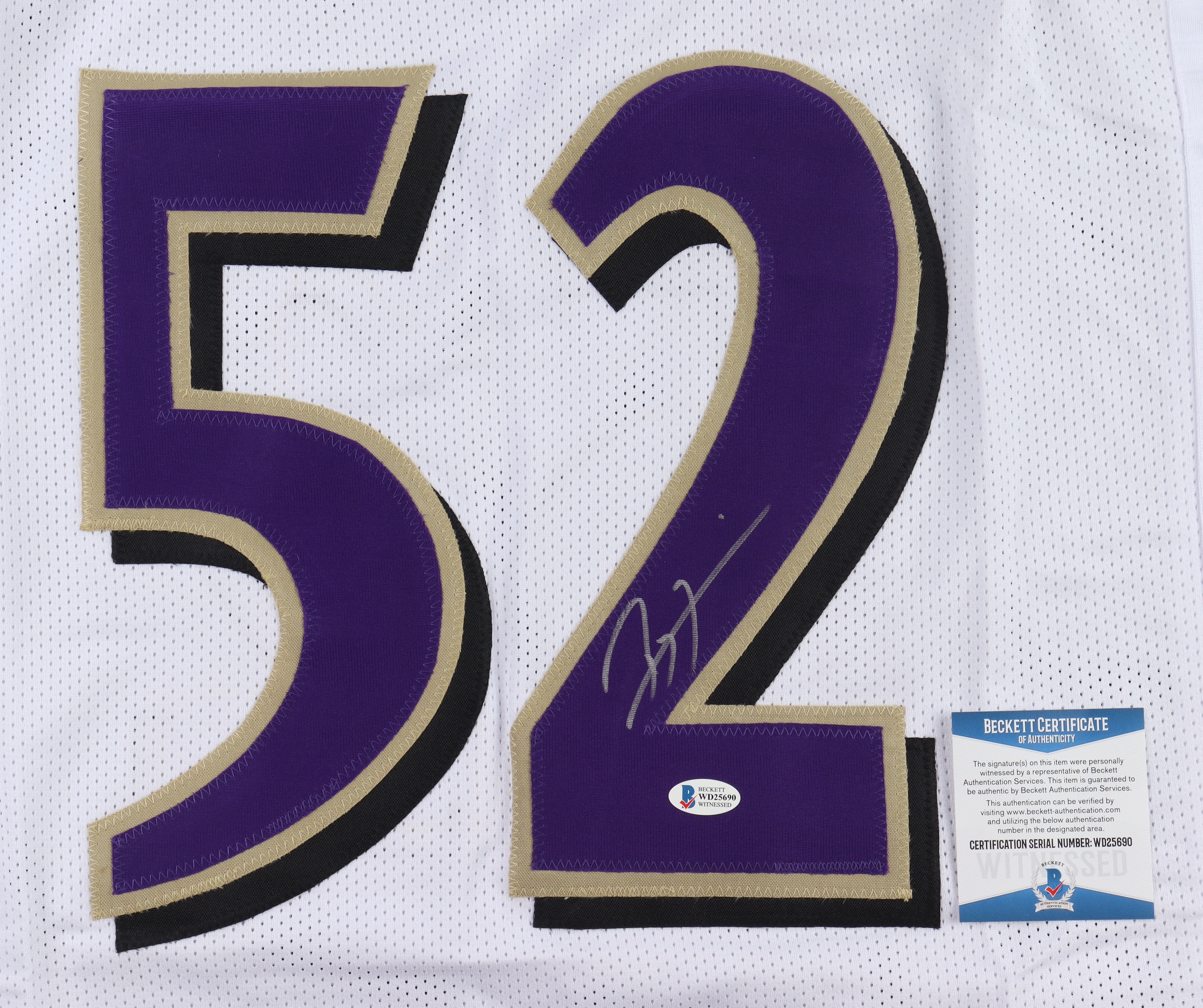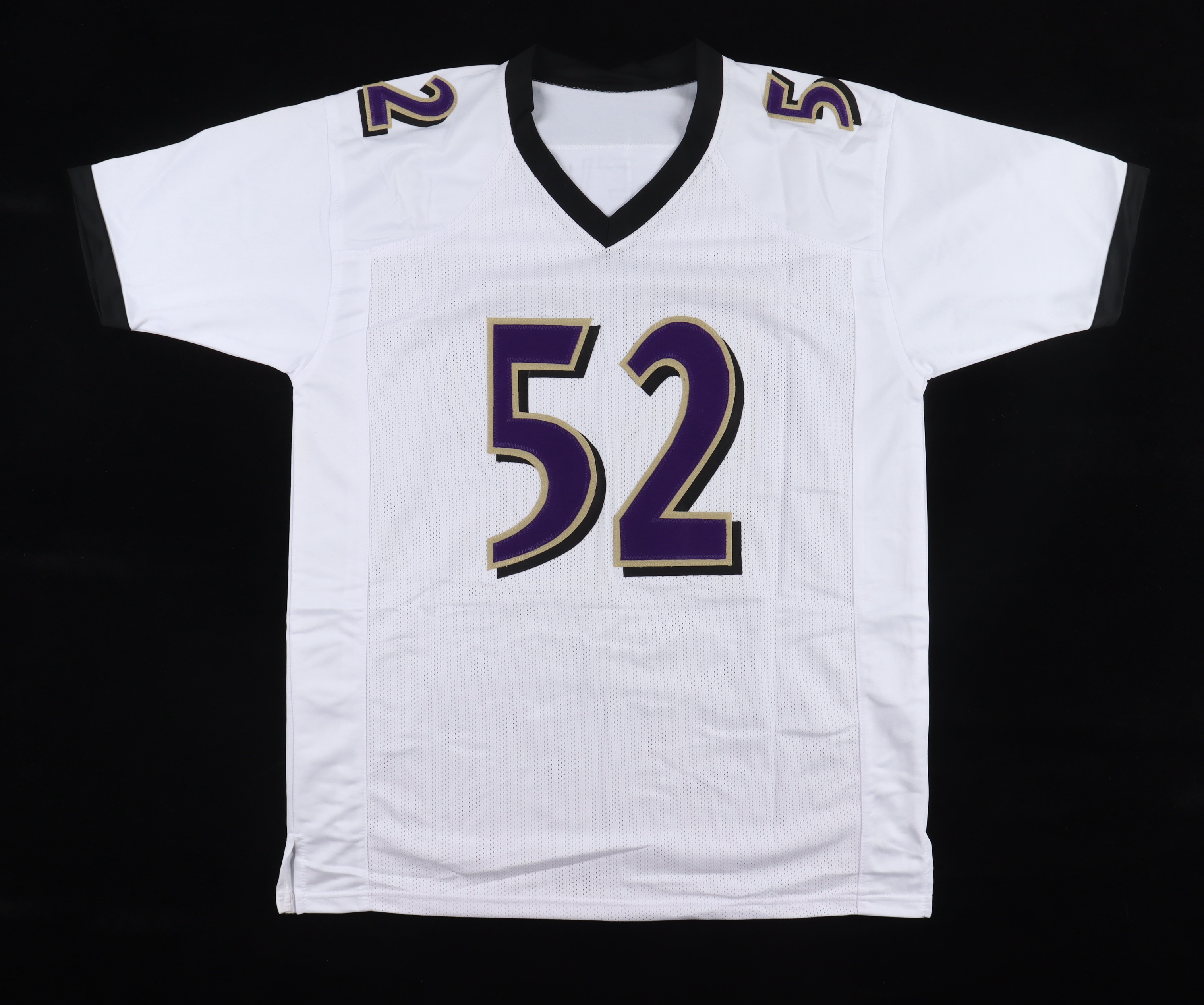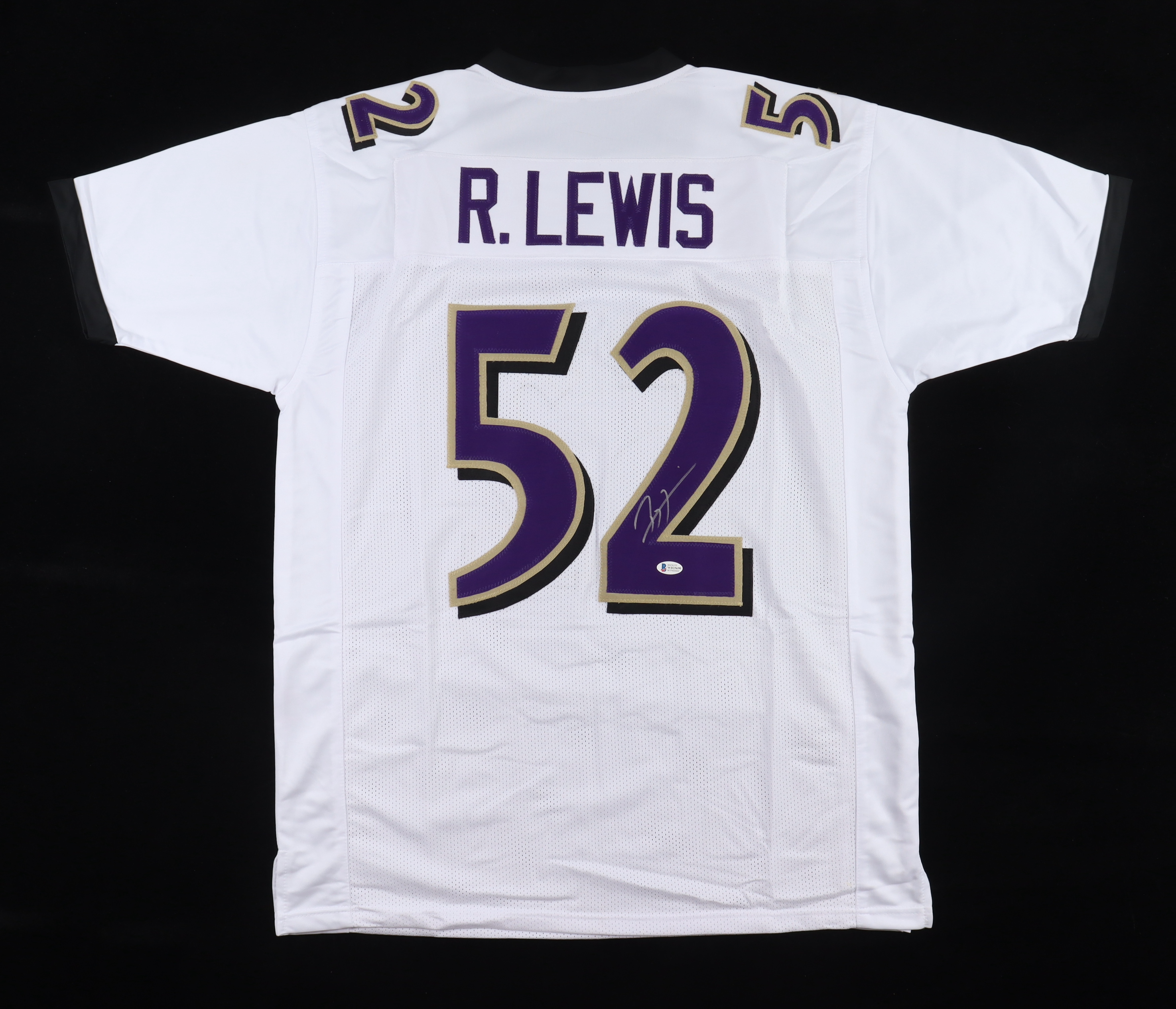 Custom jersey with everything sewn on, size XL. Hand-signed by Ray Lewis (HOF).