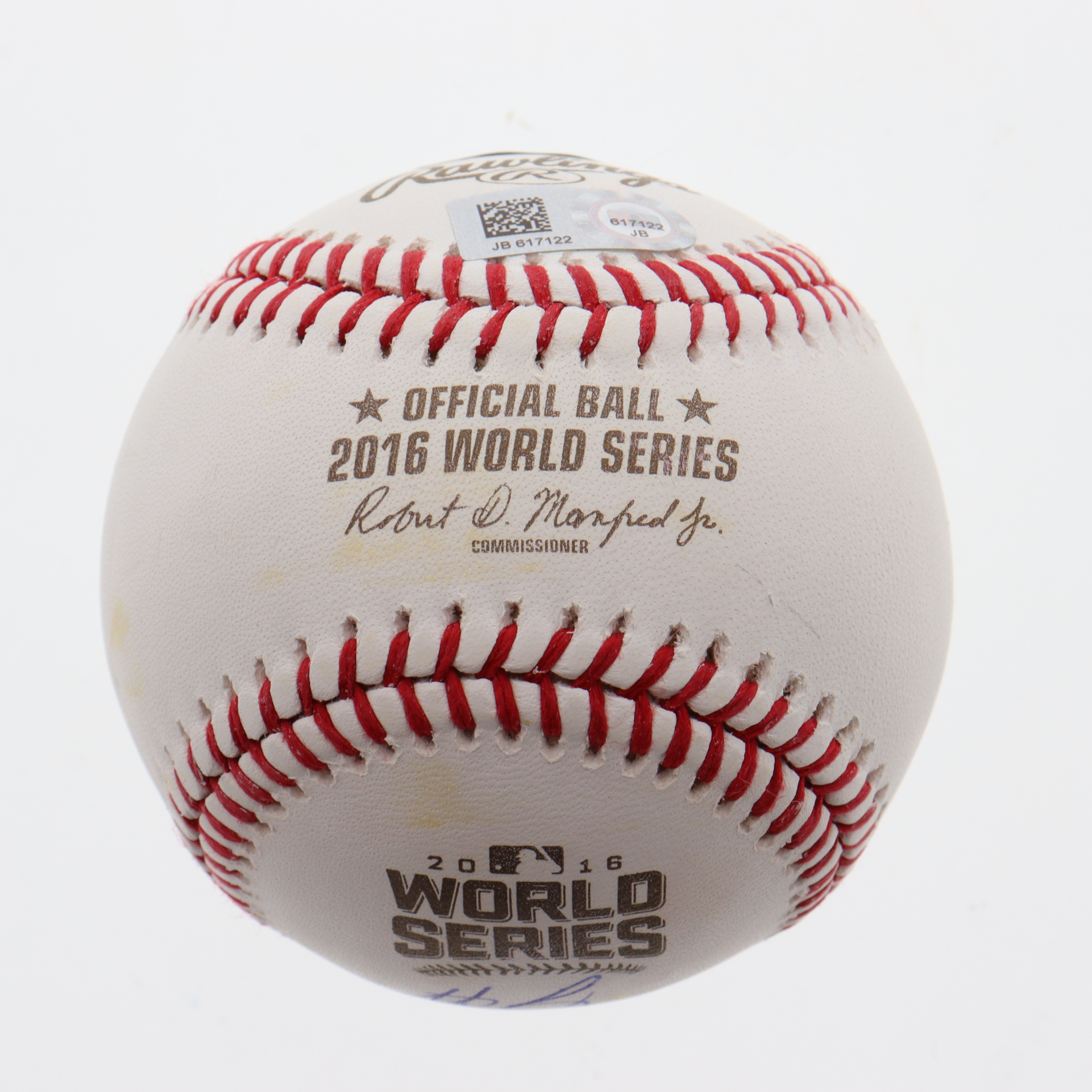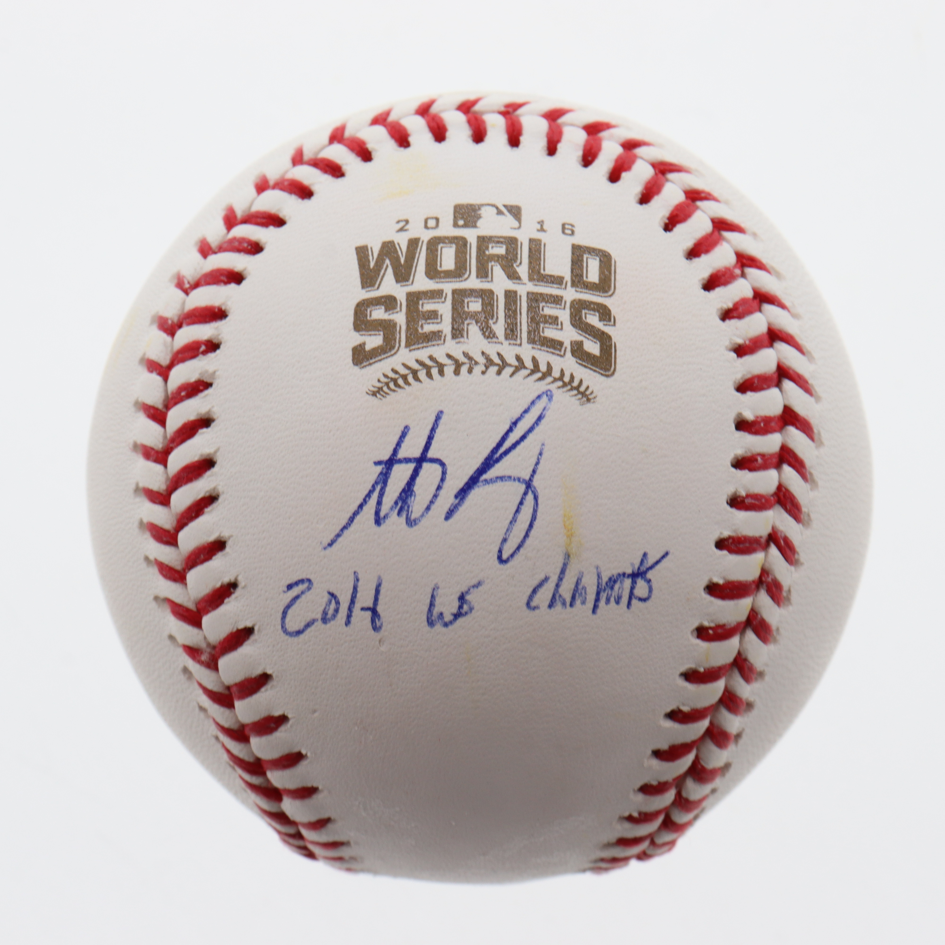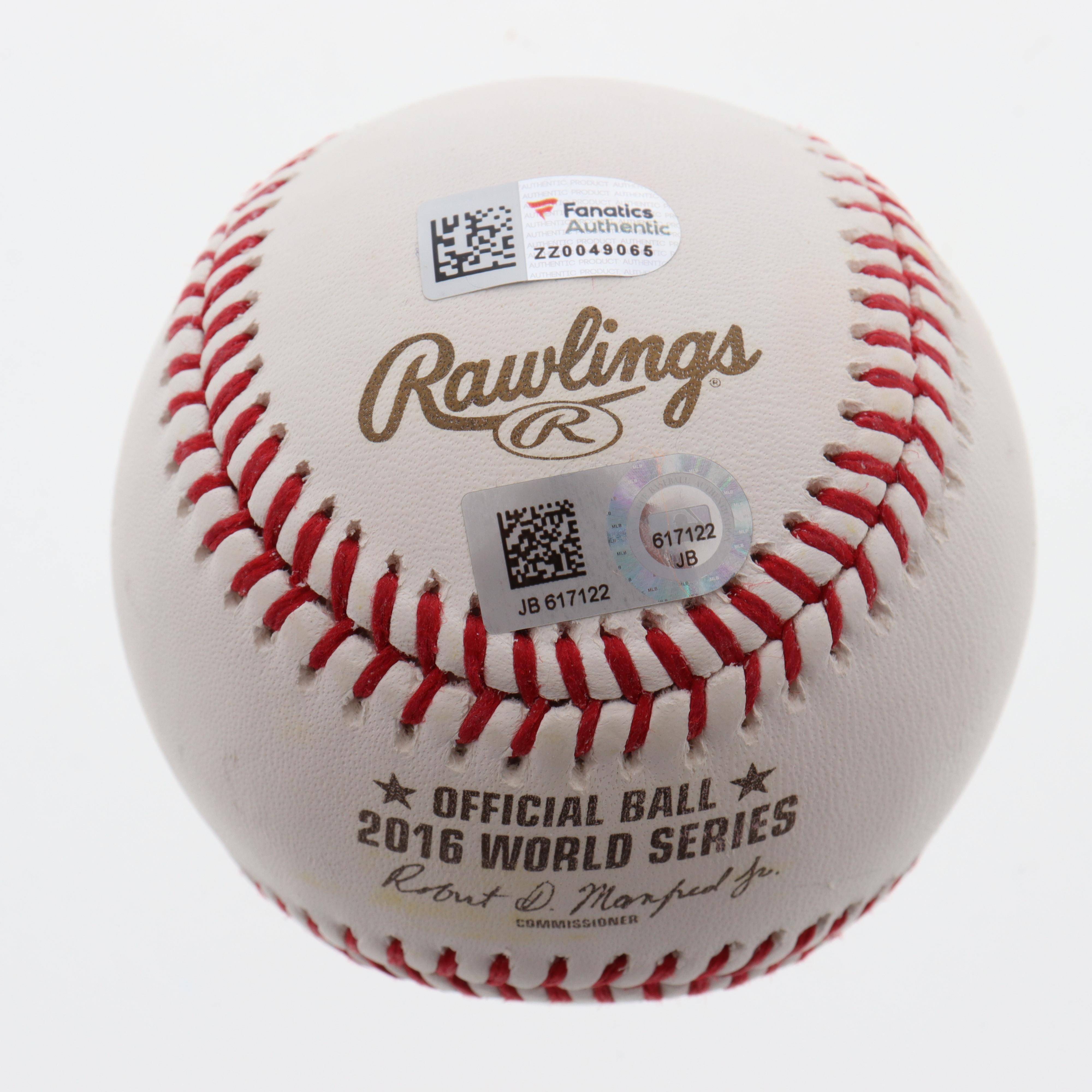 Rawlings Official 2016 World Series baseball. Hand-signed and inscribed by Anthony Rizzo (Chicago Cubs). Includes display case as shown.