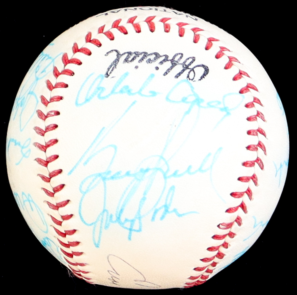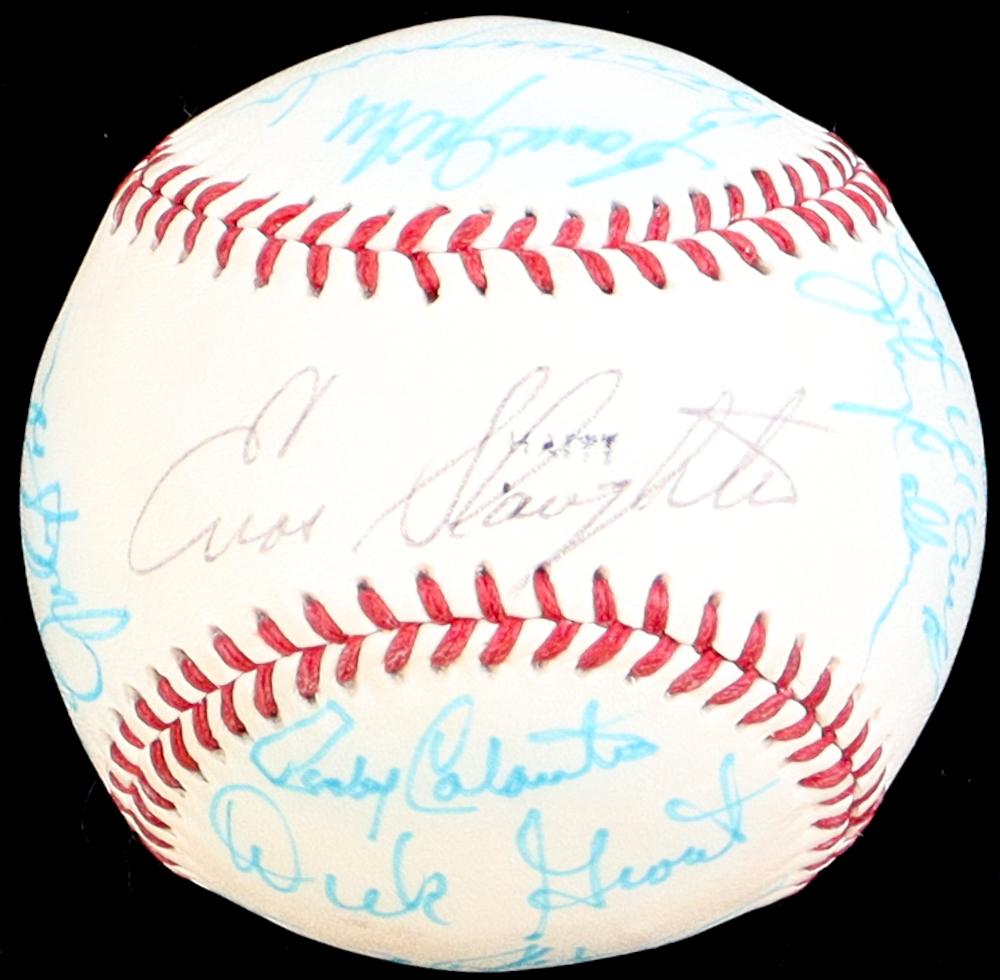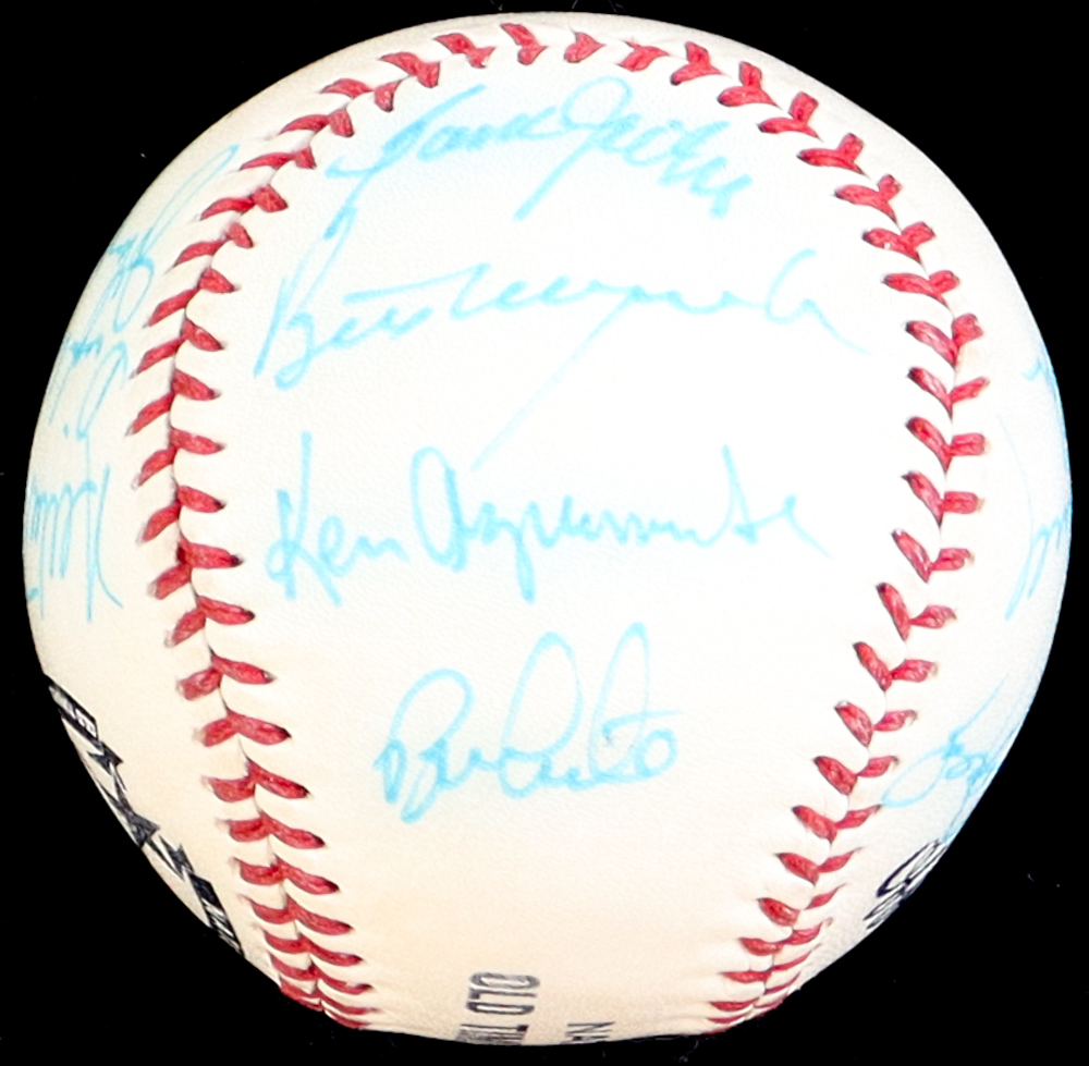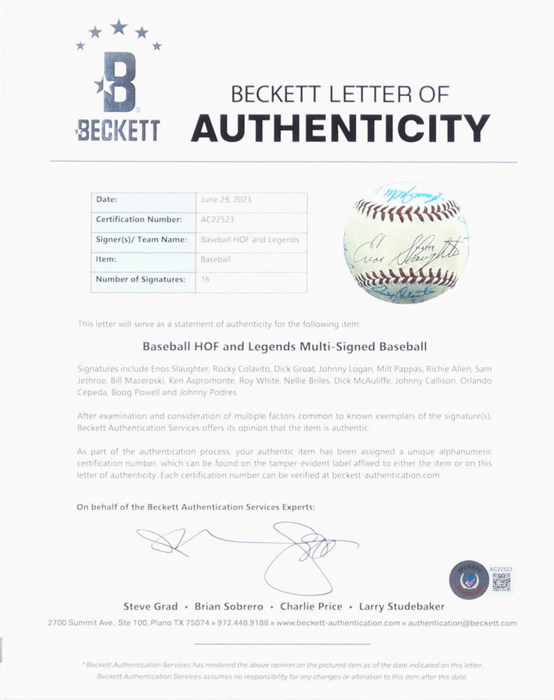 MLB Official National Old Timers Classic Legends & Hall of Famers Baseball. Hand-signed by (16) with Enos Slaughter, Rocky Colavito, Dick Groat, Johnny Logan, Milt Pappas, Richie Allen, Sam Jethroe, Bill Mazeroski, Ken Aspromonte, Roy White, Nellie Briles, Dick McAuliffe, Johnny Callison, Orlando Cepeda, Boog Powell and Johnny Podres. Includes the display case shown.