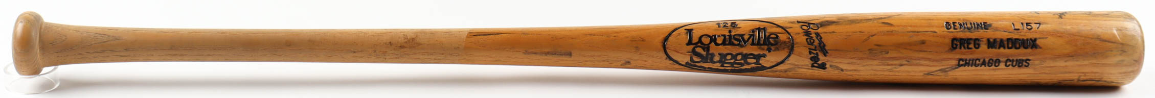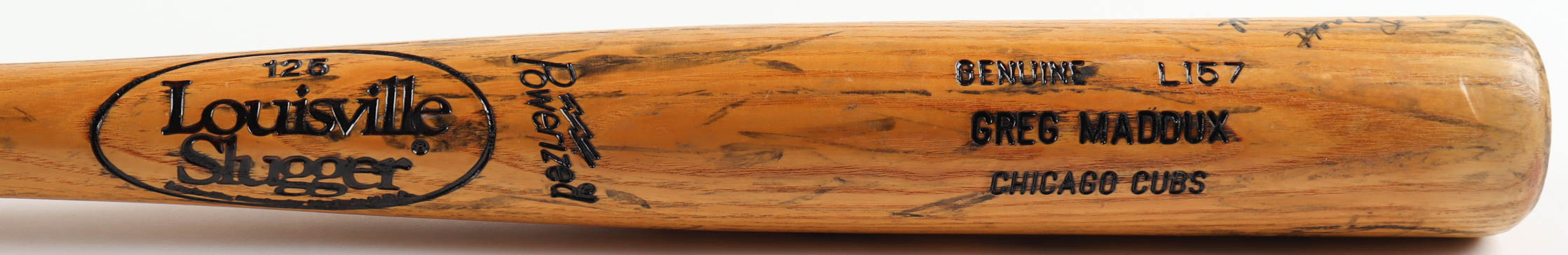 Louisville Slugger powerized baseball bat. Hand-signed by Greg Maddux (Atlanta Braves, HOF). Please see photos regarding the condition of the bat. Please note, the bat and signature shows signs of wear. Please note, bat has been personalized "To Brett".