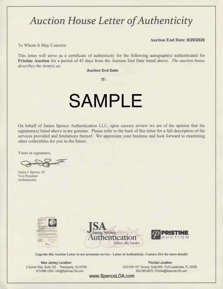 The lot / autograph(s) includes a James Spence Authentication (JSA) Auction House LOA for authenticity purposes.