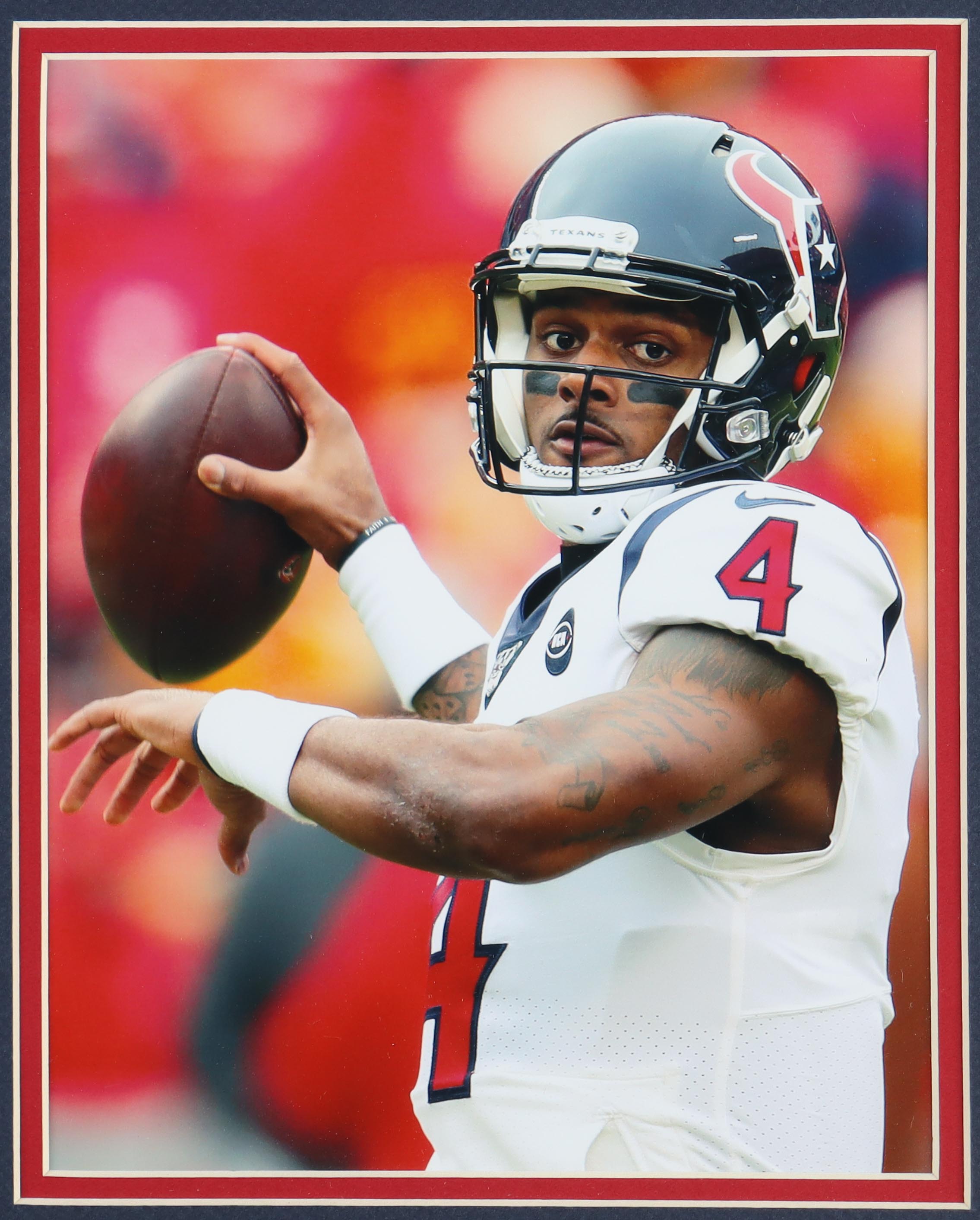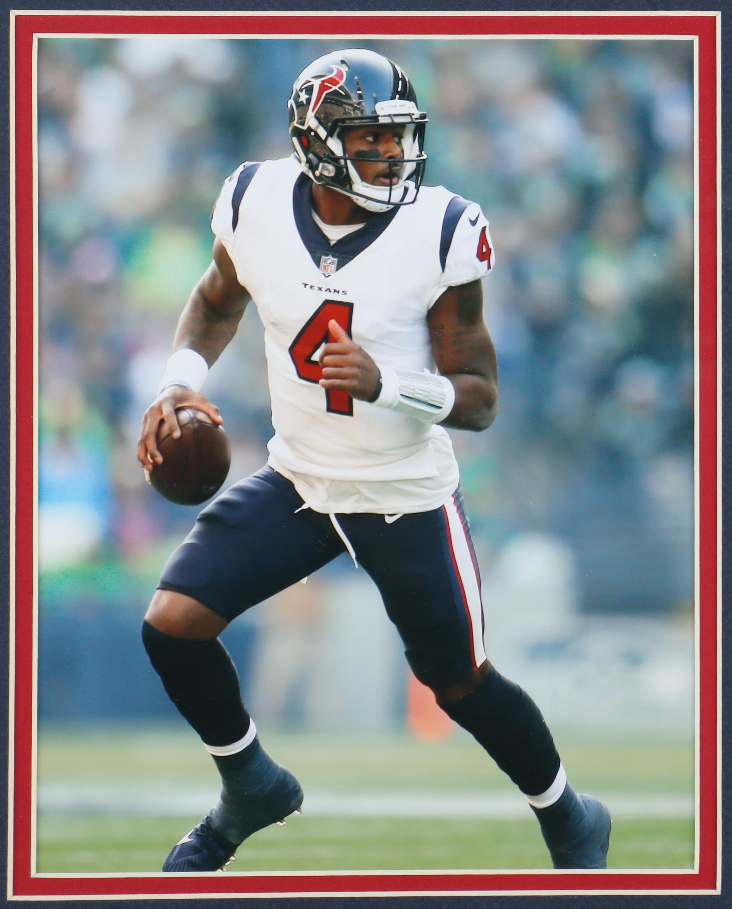 Custom frame measures approximately 34.5" x 43.5" in size and features a jersey that has been hand-signed by Deshaun Watson. Please note, the bottom of the frame has a chip and shows wear.