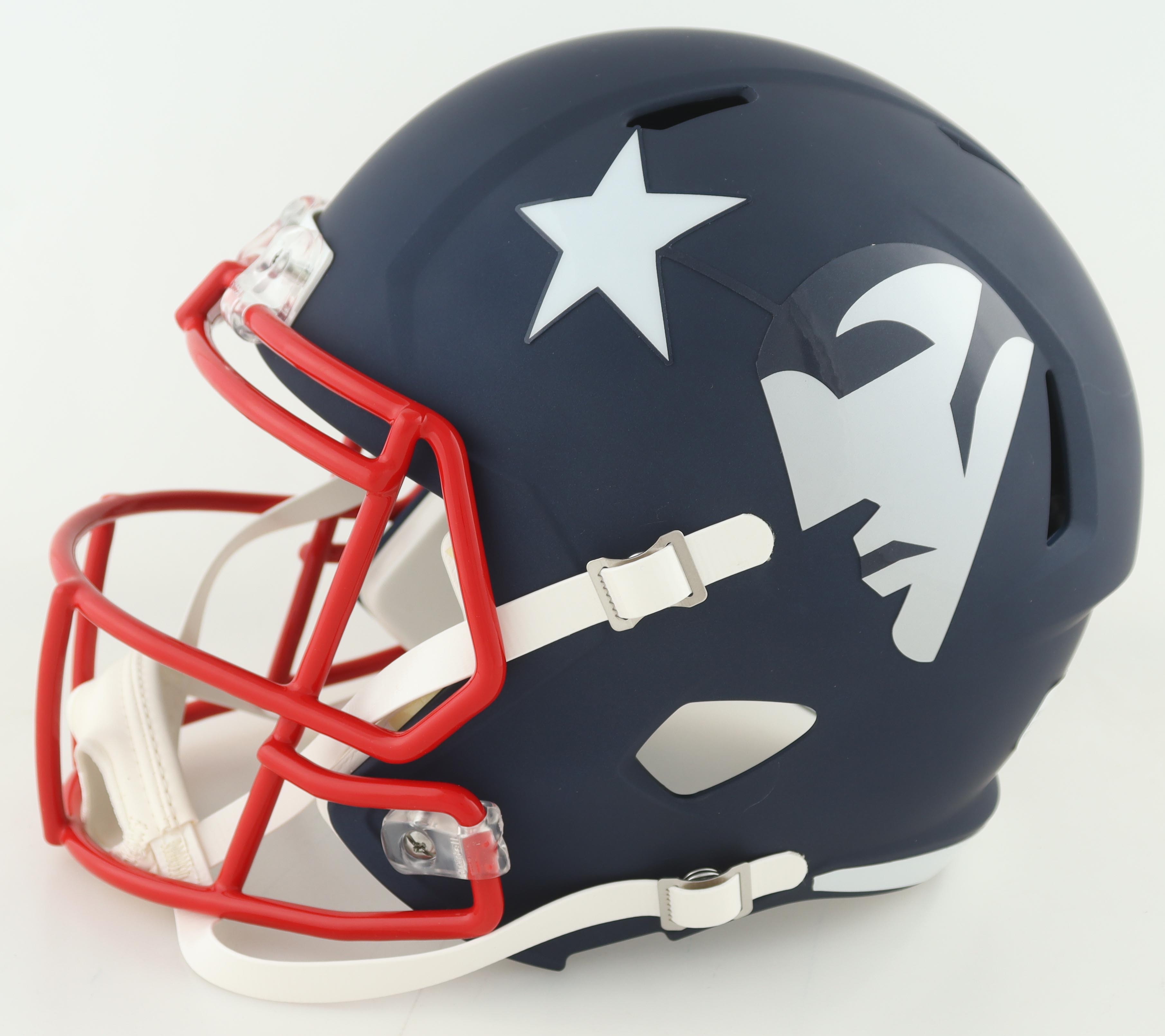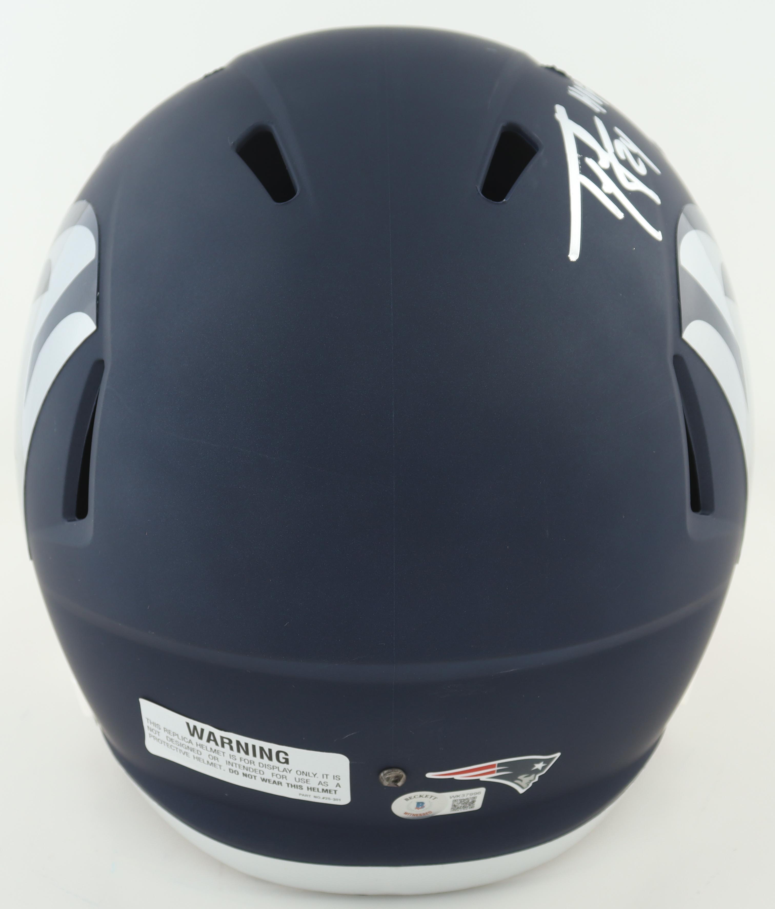 Riddell New England Patriots full-size replica AMP Alternate Speed Helmet. Has been hand-signed and inscribed by Ty Law.
