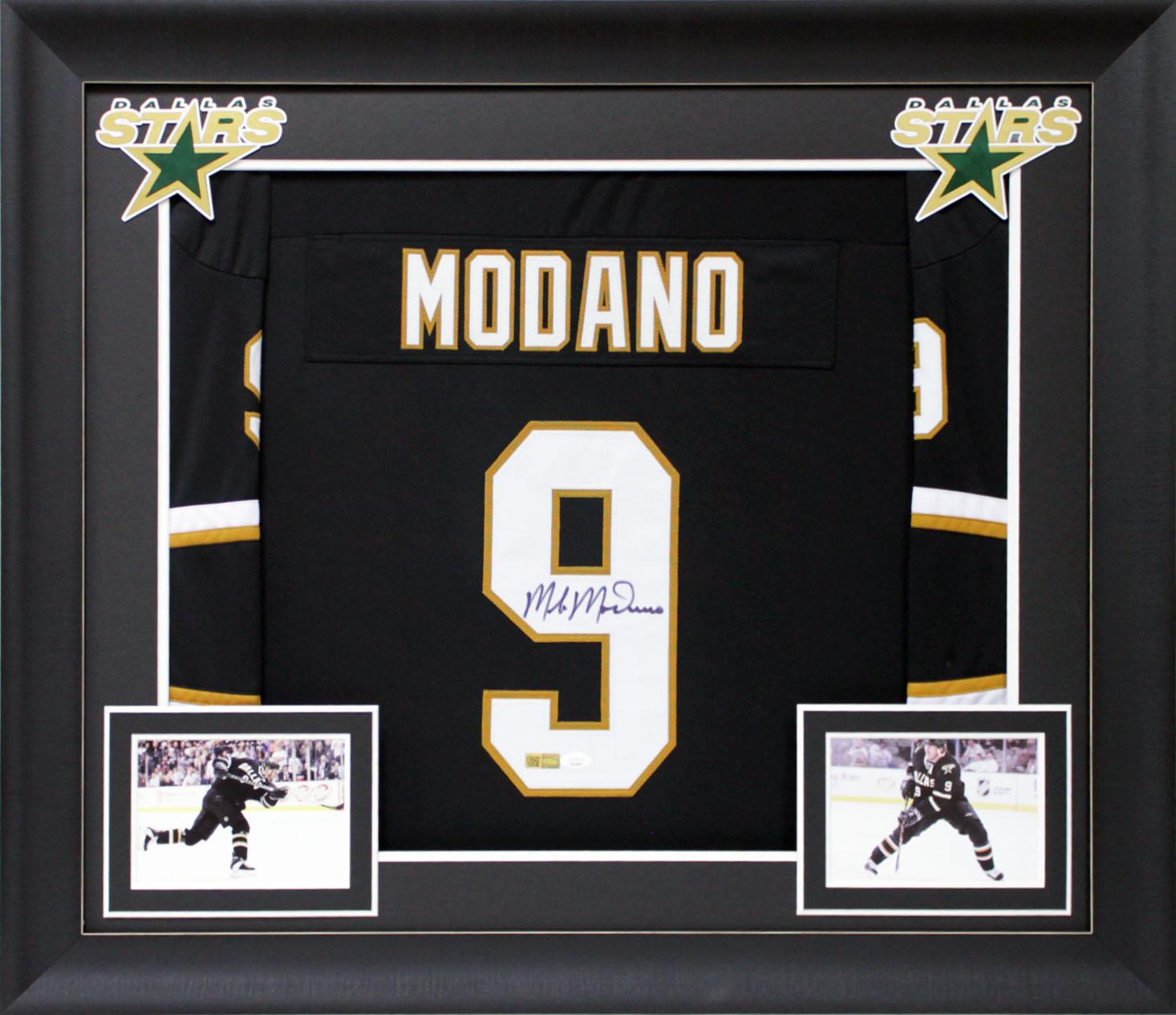 Custom frame measures approximately 32" x 37" in size and features a jersey that has been hand-signed by Mike Modano (HOF).