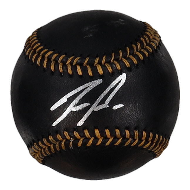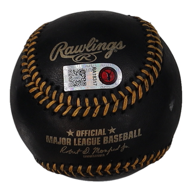 Rawlings Official Major League Black Leather Baseball. Hand-signed by Ronald Acuna Jr. (Atlanta Braves). Please note, the signature is smudged and there are minor stray ink marks throughout.