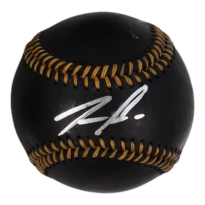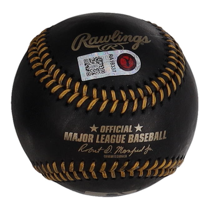 Rawlings Official Major League Black Leather Baseball. Hand-signed by Ronald Acuna Jr. (Atlanta Braves). Please note, the signature is smudged and there are minor stray ink marks throughout.