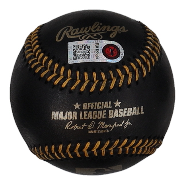 Rawlings Official Major League Black Leather Baseball. Hand-signed by Ronald Acuna Jr. (Atlanta Braves). Please note, the signature is smudged and there are stray ink marks throughout.