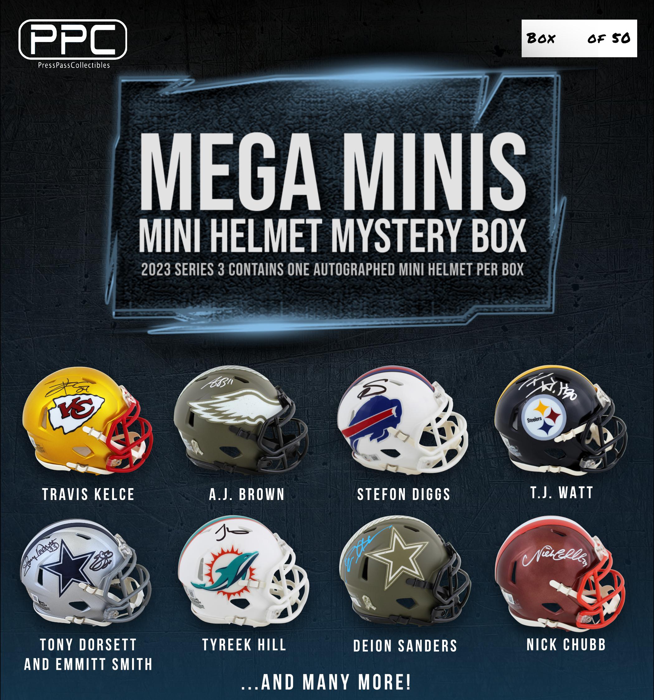 The Press Pass Collectibles 2023 mega mini helmet mystery box includes one (1) mini helmet from your favorite NFL teams. Some boxes will feature mini helmets signed by Emmitt/Dorsett Combo, Tyreek Hill, Deion Sanders, Nick Chubb, and many more!