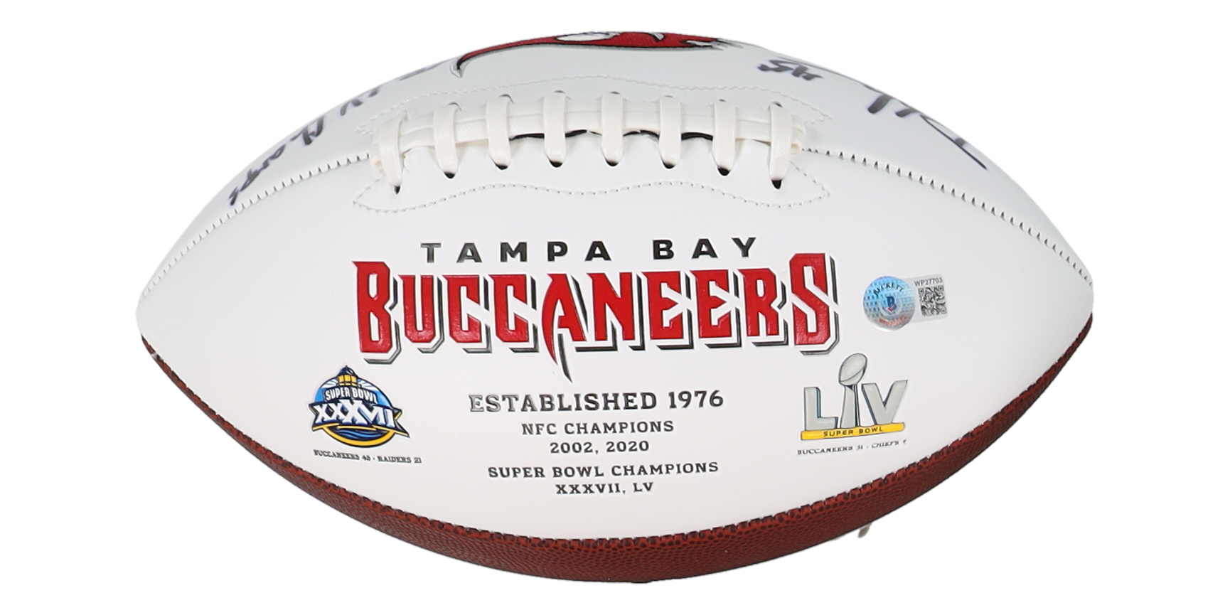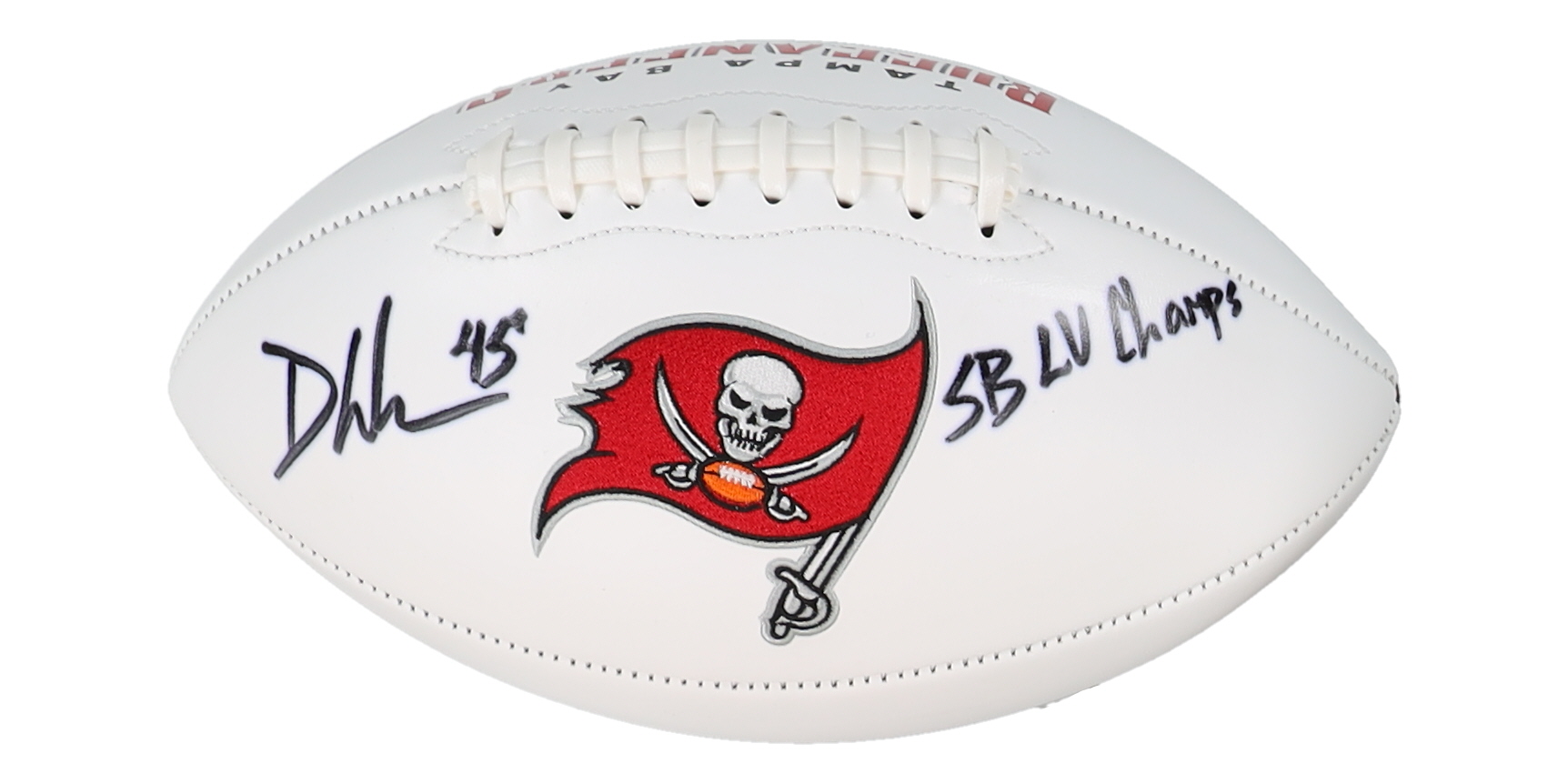Tampa Bay Buccaneers logo football. Hand-signed and inscribed by Devin White.