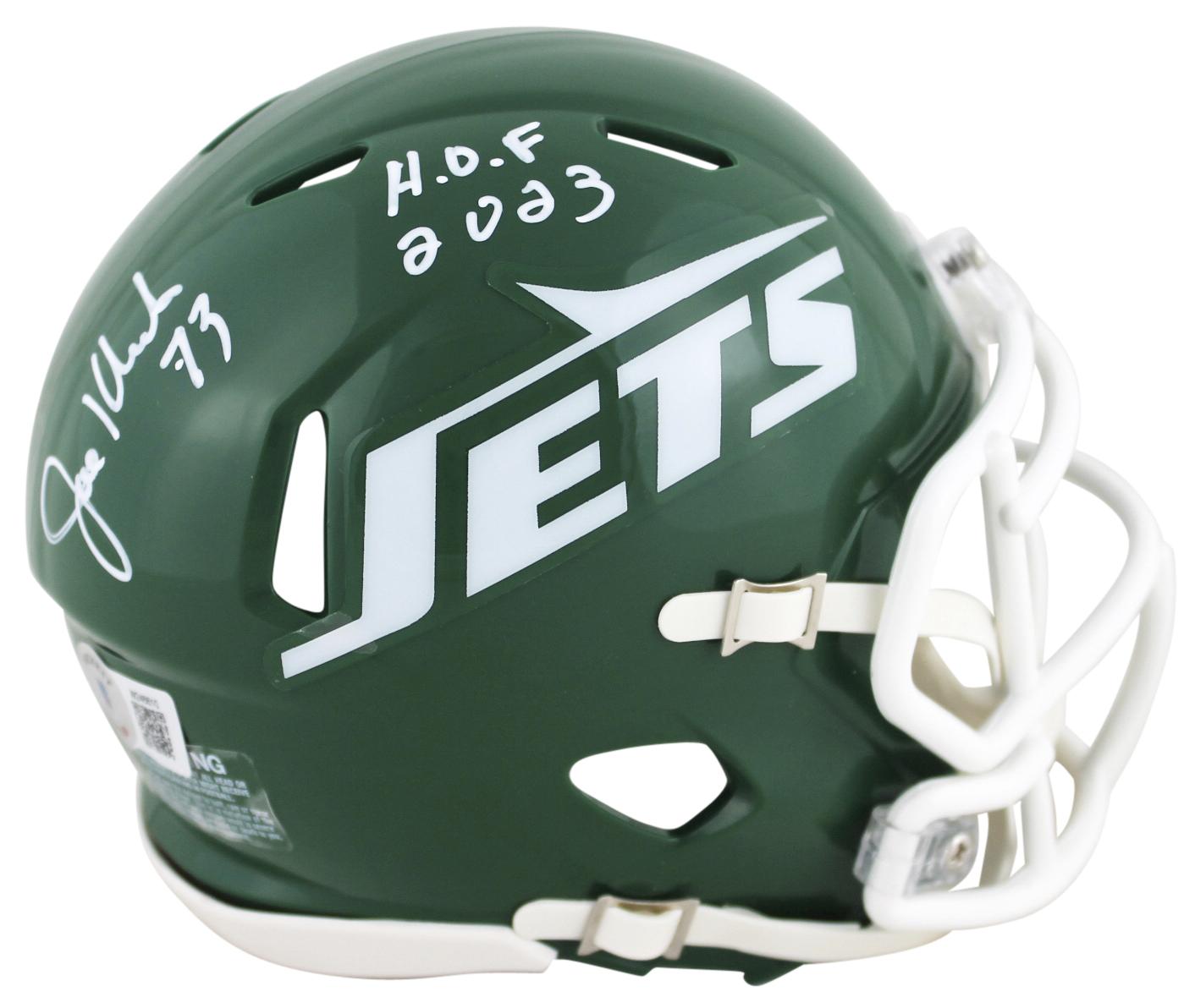 Riddell New York Jets speed mini helmet has been hand-signed and inscribed by Joe Klecko.