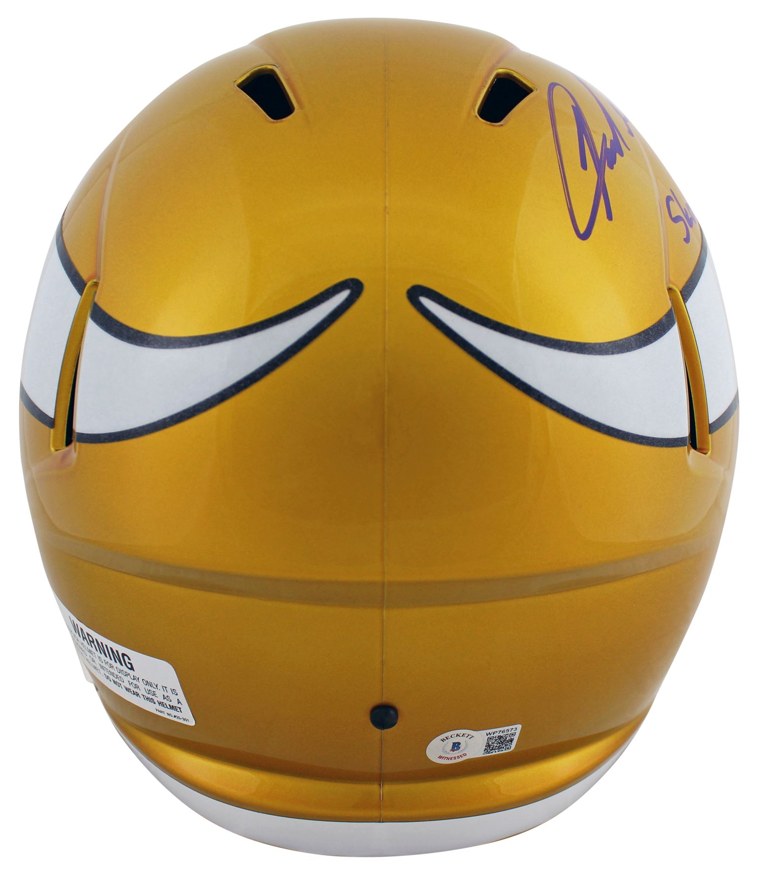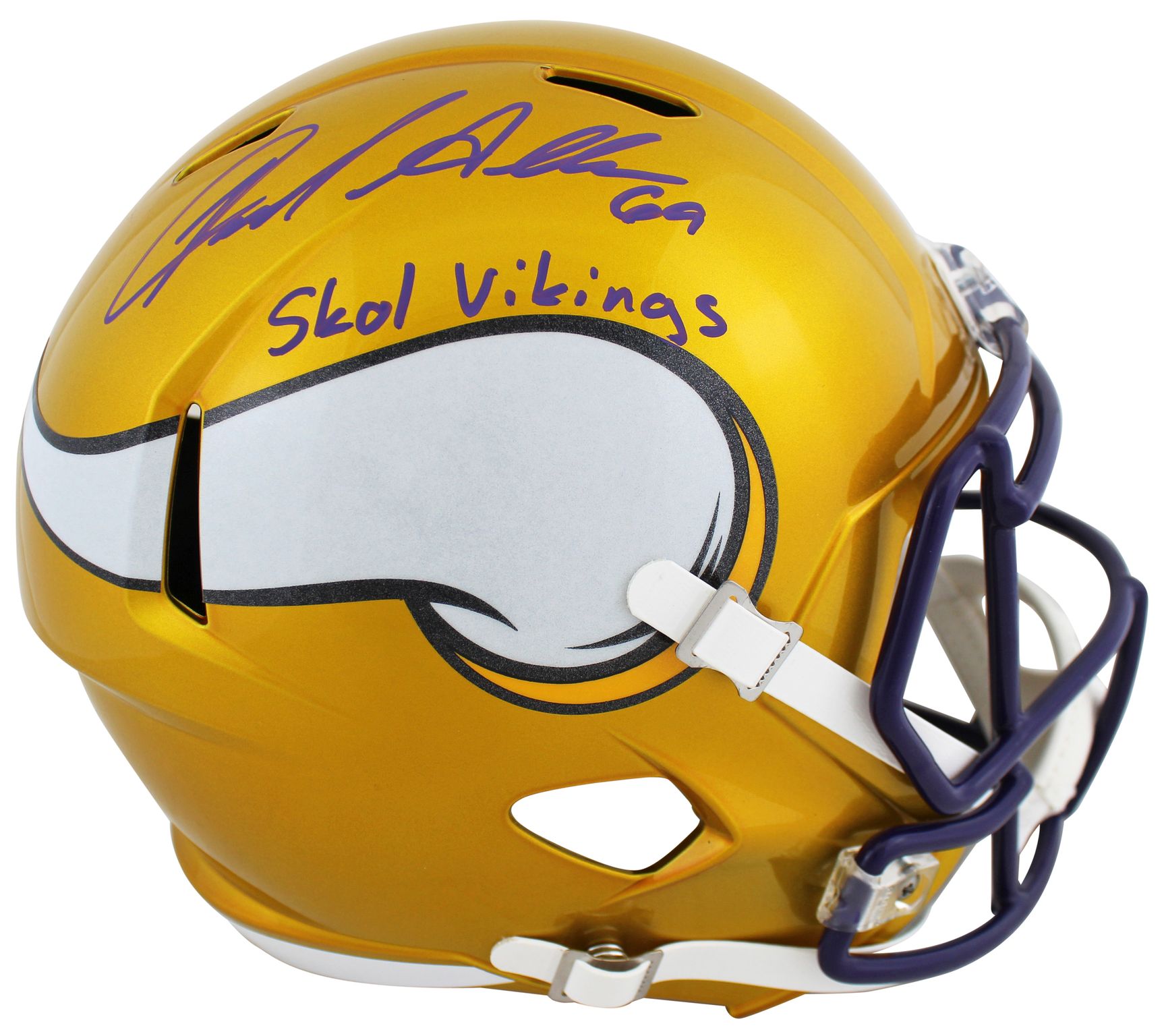 Riddell Minnesota Vikings full-size replica Flash Alternate Speed helmet. Hand-signed and inscribed by Jared Allen.