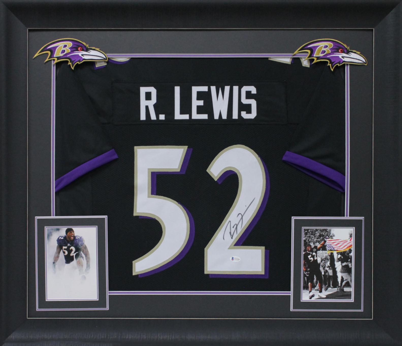 Custom frame measures approximately 32" x 37" in size and features a jersey hand-signed by Ray Lewis. The display also includes (2) photographs of Ray Lewis (HOF).