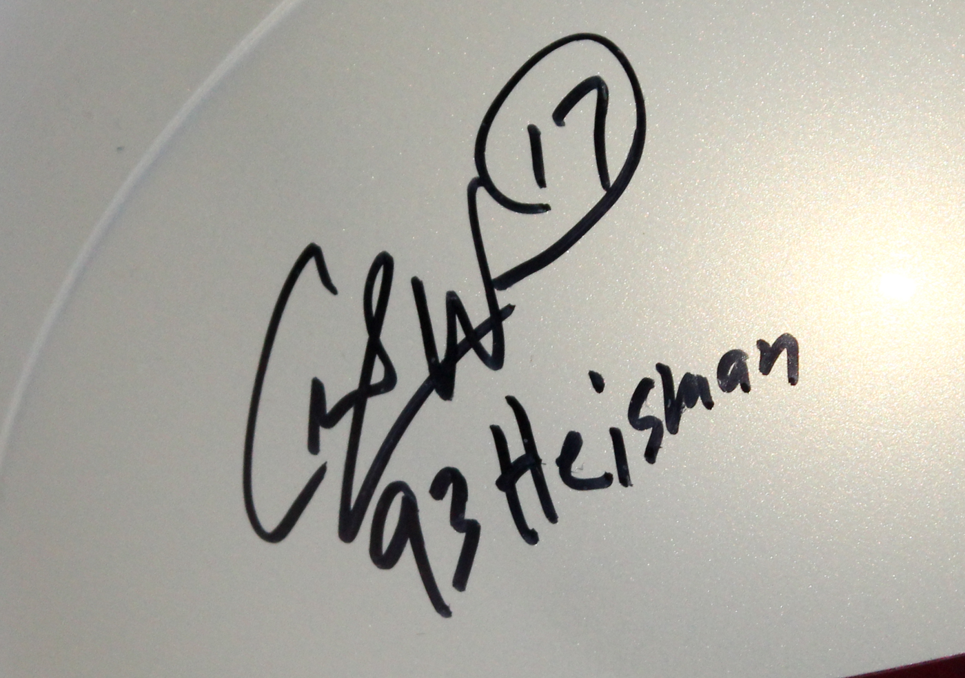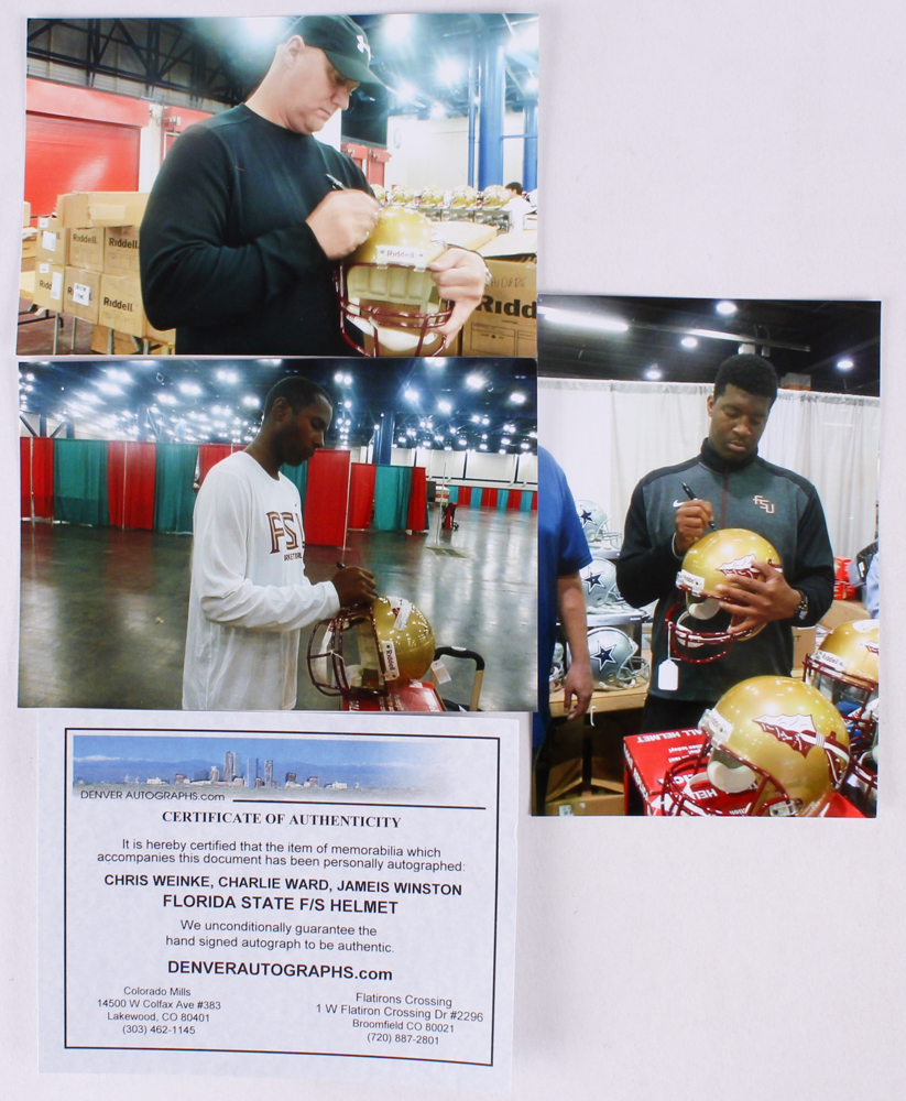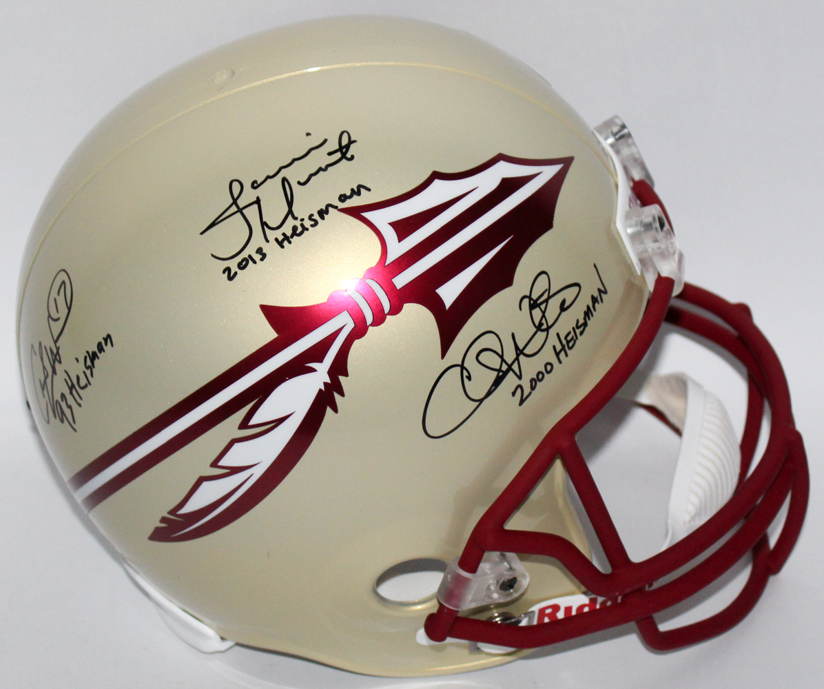 Riddell full-size replica helmet. Hand-signed and inscribed in black felt-tip pen by Jameis Winston (Buccaneers), Charlie Ward and Chris Weinke (Panthers).