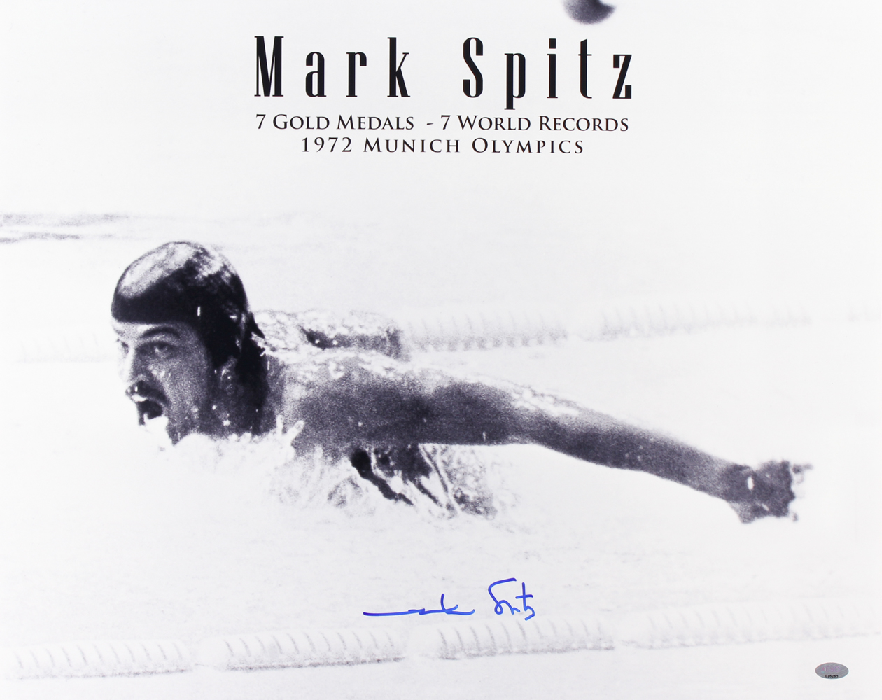 Photo measures 16" x 20" in size and has been hand-signed in blue felt-tip pen by Mark Spitz (Swimmer).