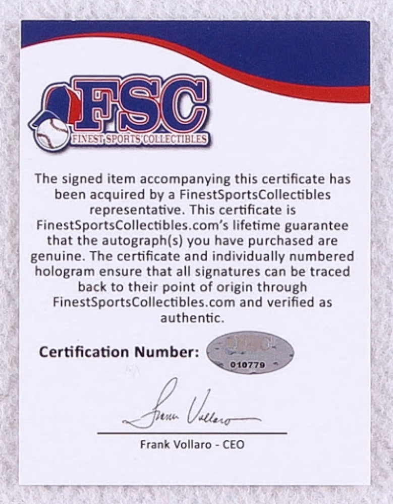 The autograph includes an official Finest Sports Collectibles (FSC) hologram and matching COA for authenticity purposes.