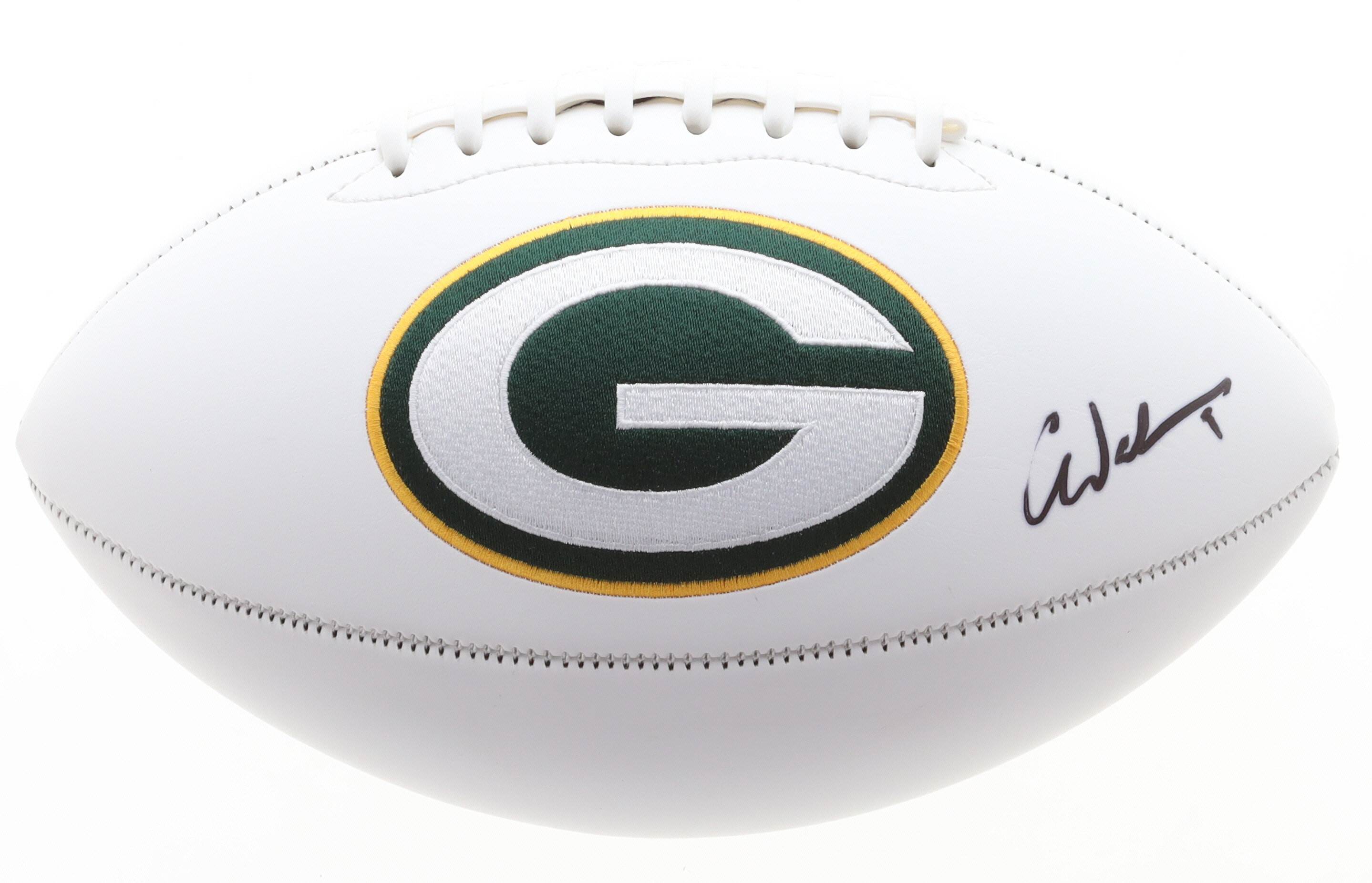 Green Bay Packers logo football has been hand-signed by Christian Watson.