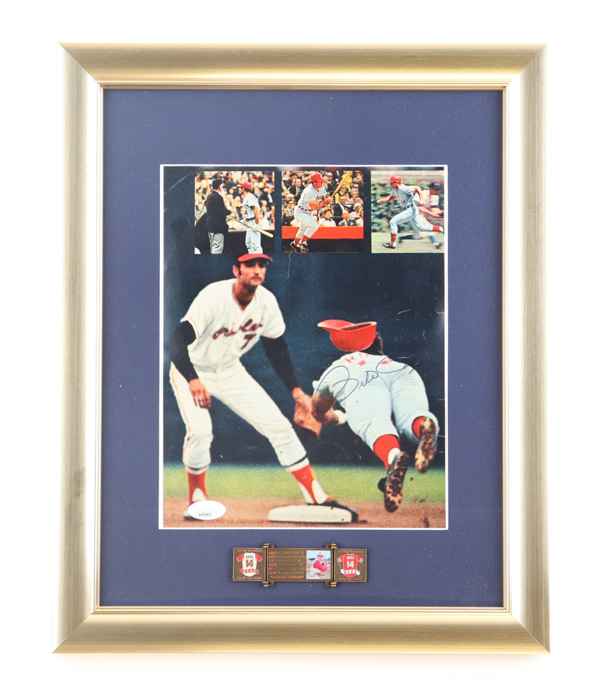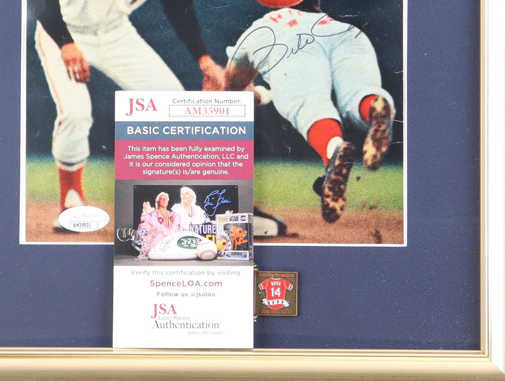 The custom framed photo display measures 13" x 16" in size and features a photo that has been hand-signed by Pete Rose (Cincinnati Reds). Display also features a career stat bronze plaque.