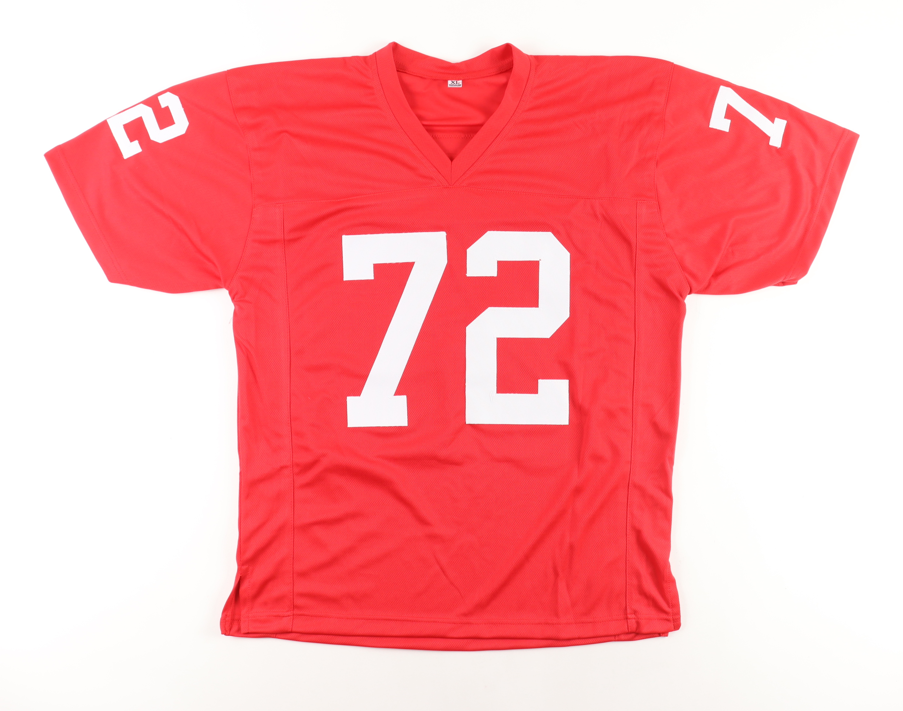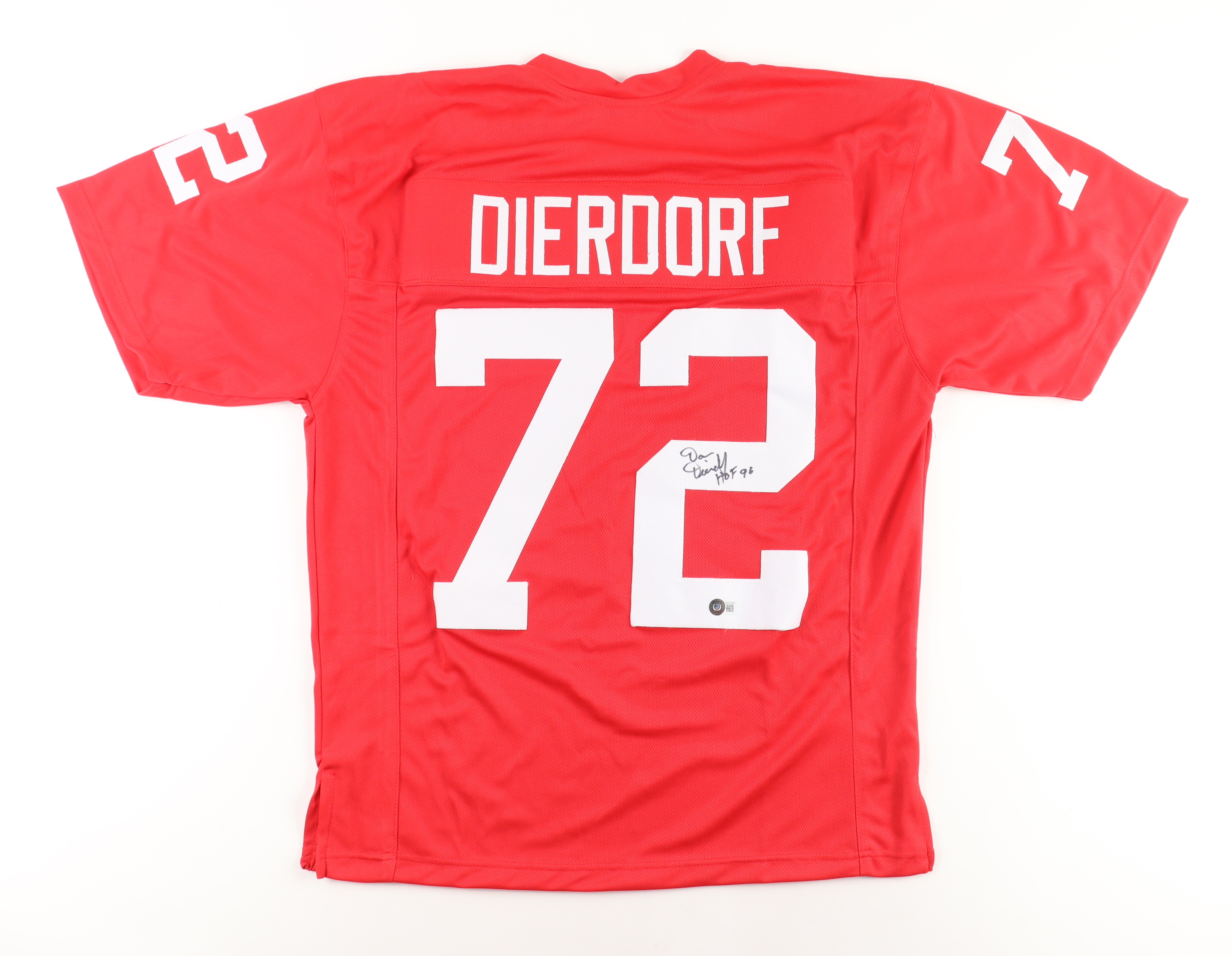 Custom jersey with everything sewn on, size XL. Hand-signed and inscribed by Dan Dierdorf (HOF).