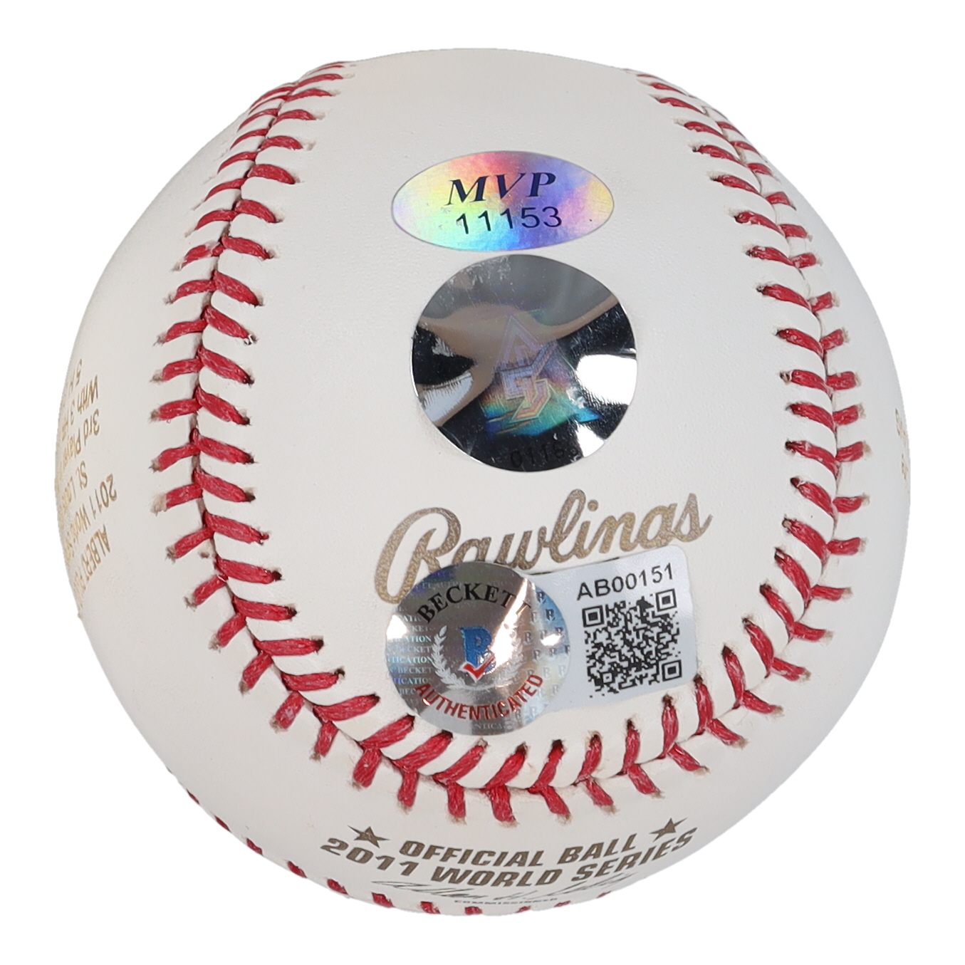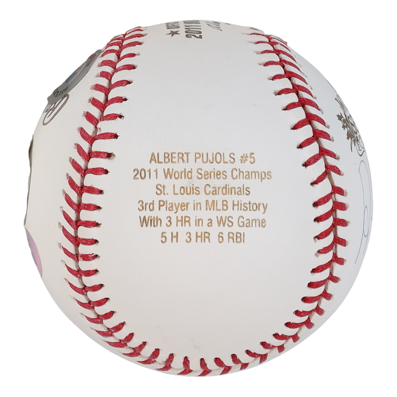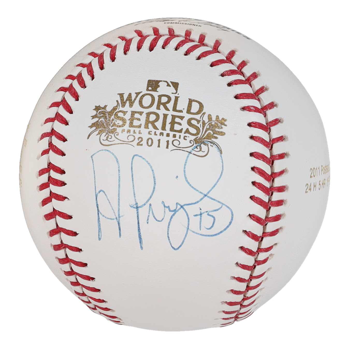 Rawlings Official 2011 World Series Baseball. Hand-signed by Albert Pujols (St. Louis Cardinals). Pujols's career statistics have been etched onto the leather.