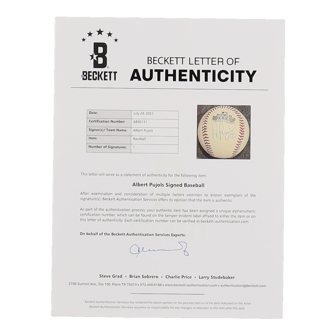 Authentication: Pujols Hologram & Beckett LOA