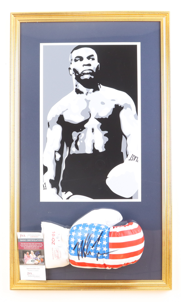 Custom frame measures approximately 17" x 29" in size and features a USA vintage boxing glove that has been hand-signed by Mike Tyson (HOF). The display also includes a photo print.