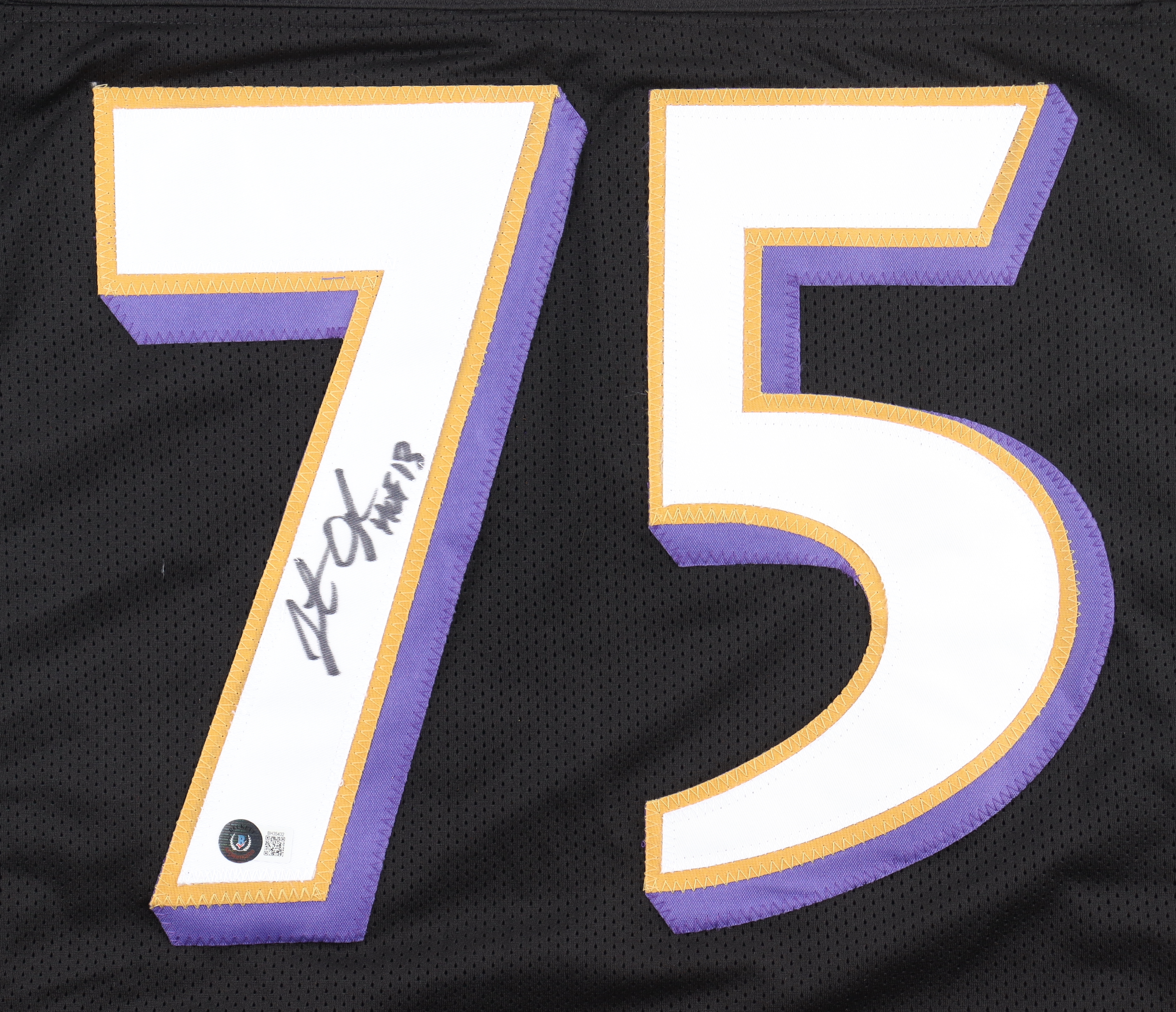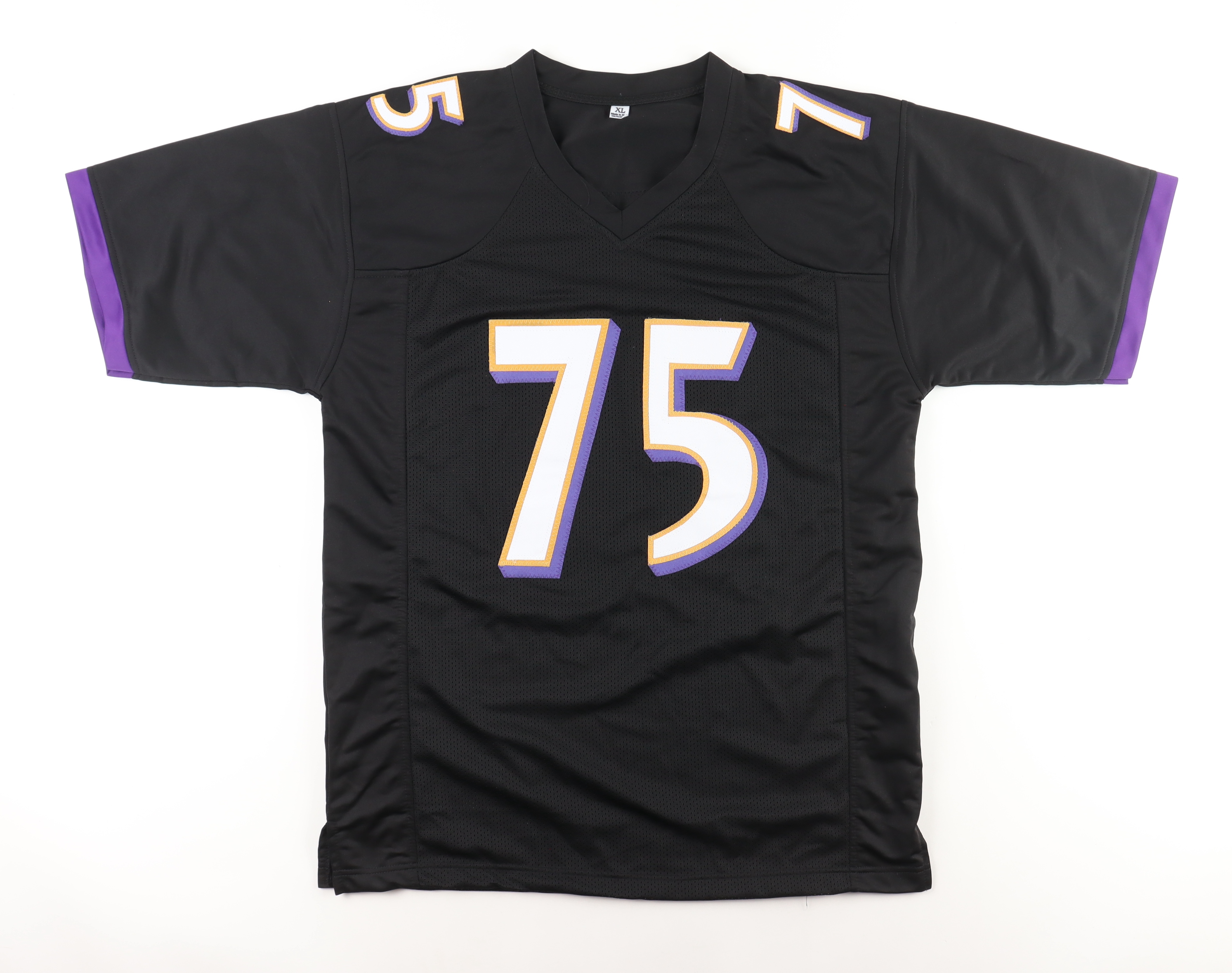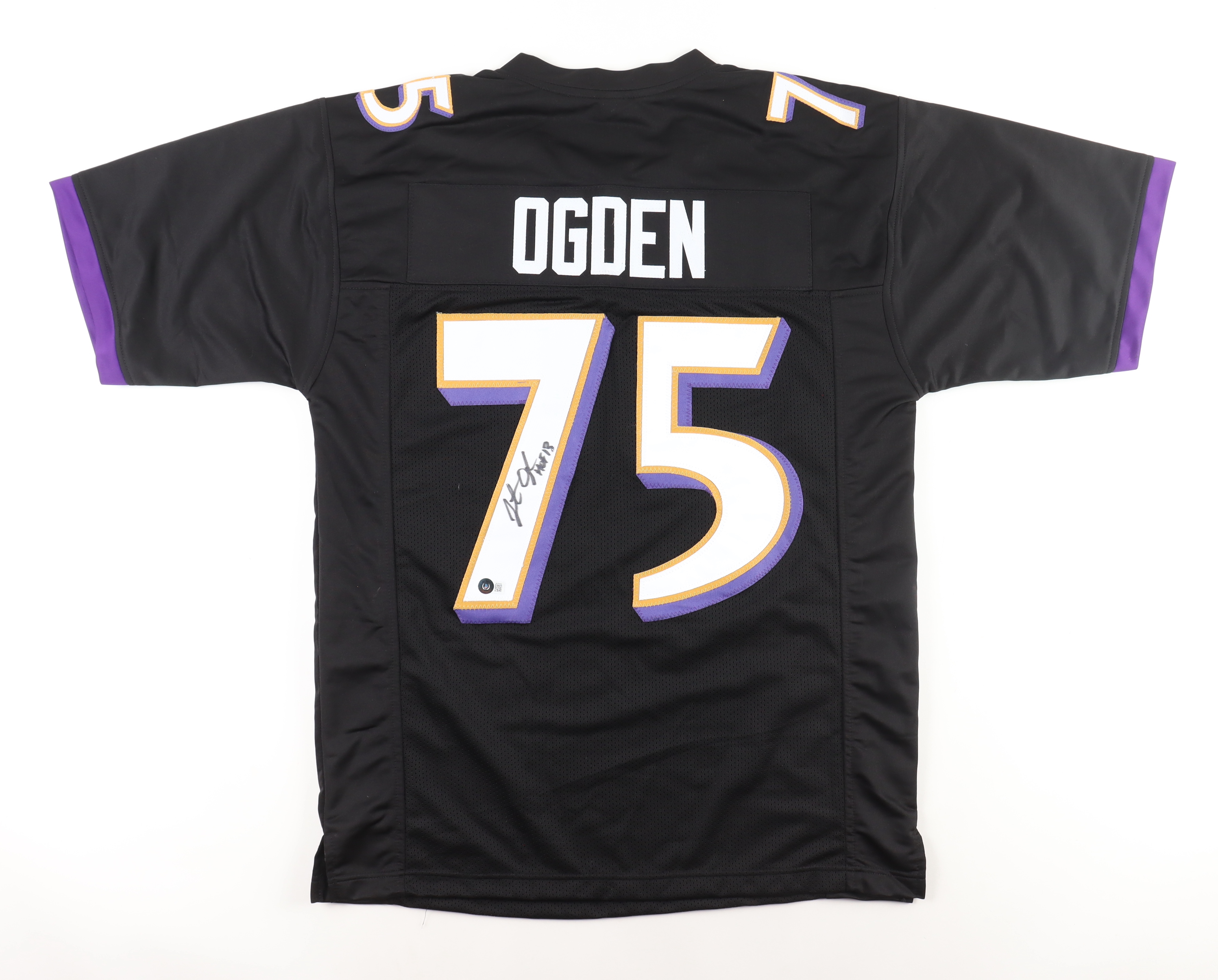 Custom jersey with everything sewn on, size XL. Hand-signed and inscribed by Jonathan Ogden (HOF).