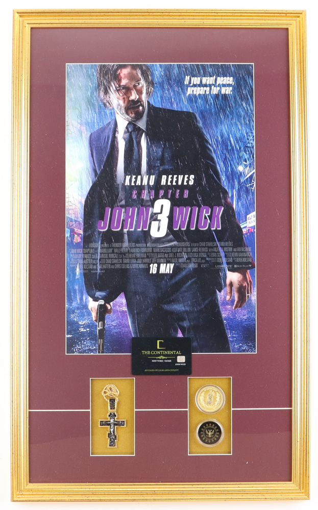 "John Wick Chapter 3 Parabellum" Custom Framed Movie Poster Display with Cross Medallion, Gold Coin, Adjudicator Coin & Continental Key Card