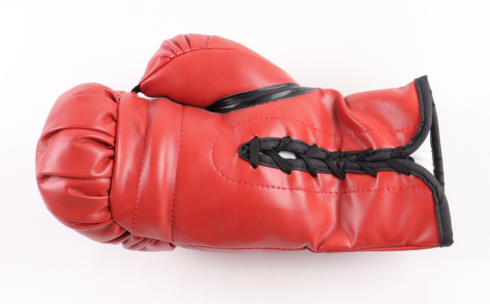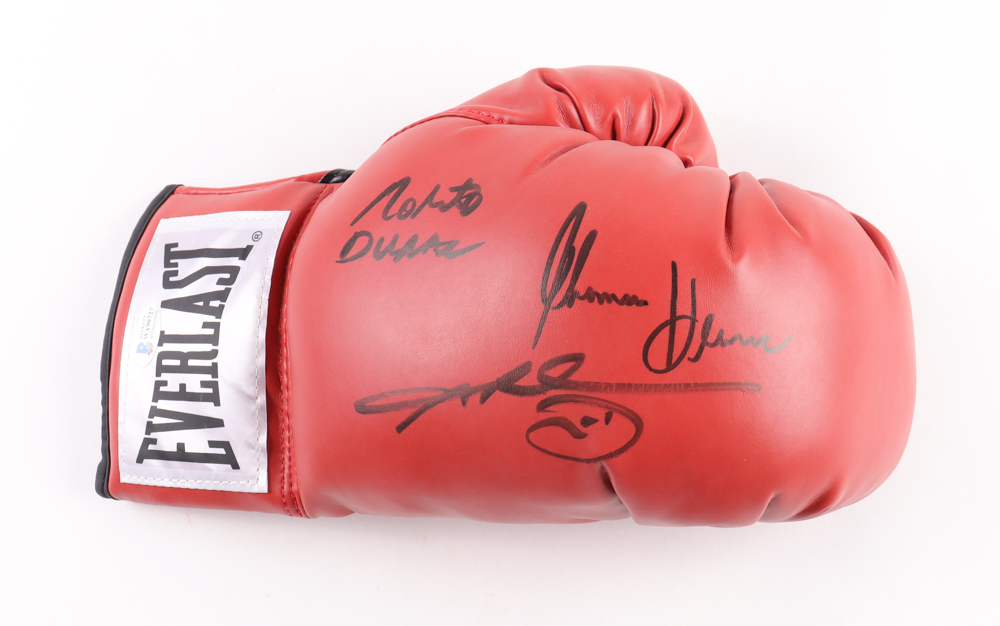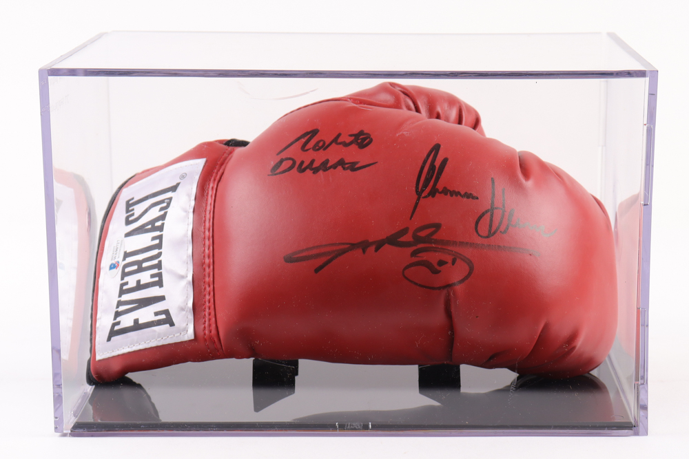 Full-size Everlast boxing glove hand-signed by Sugar Ray Leonard, Roberto Duran & Thomas Hearns. Includes display case as shown.