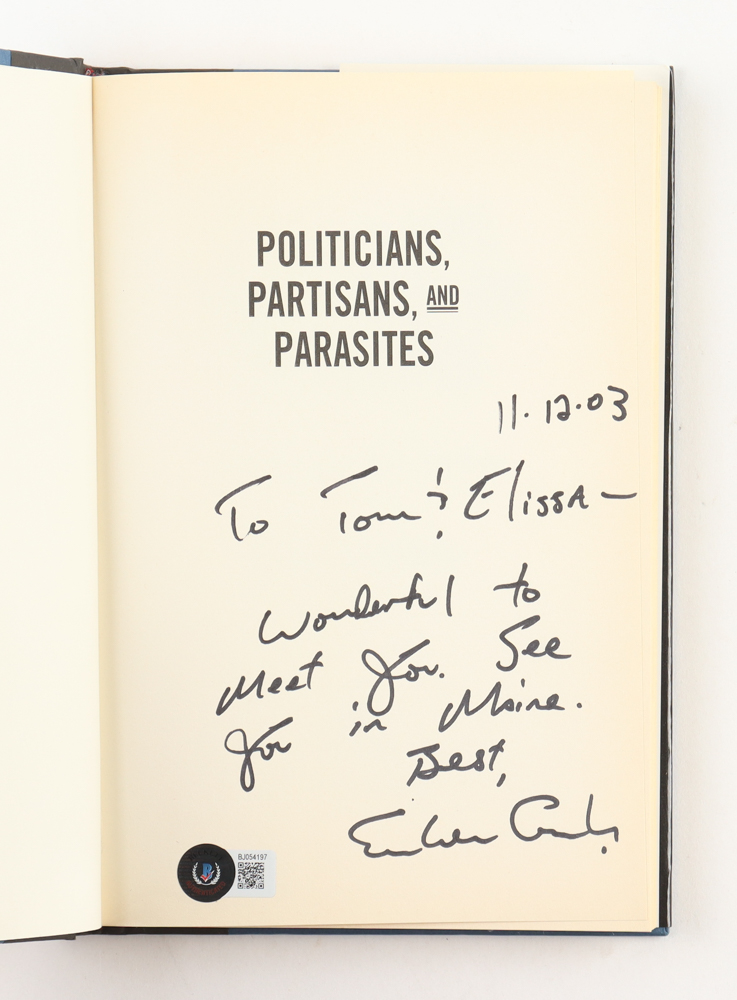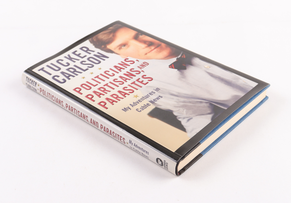 "Politicians, Partisans, and Parasites" hardcover book. Hand-signed on the inside cover by Tucker Carlson. Please note, book has been personalized to "Tom & Elissa".