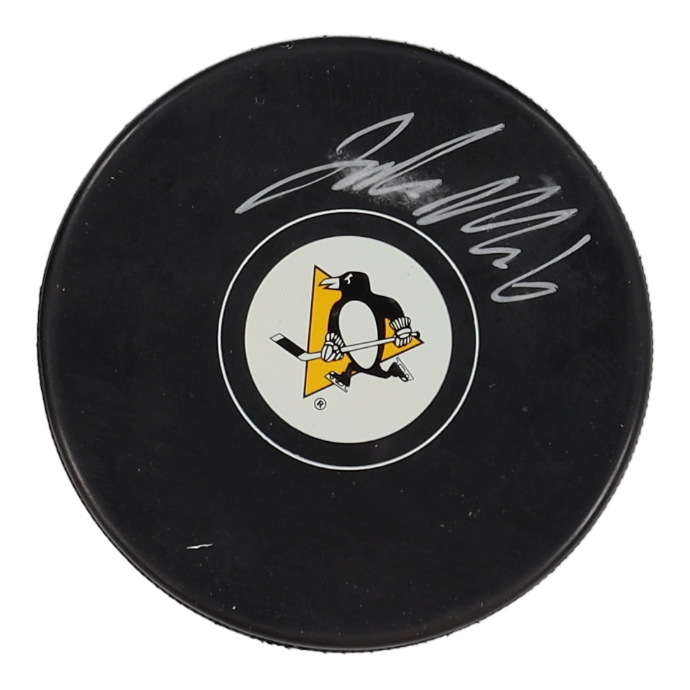 Pittsburgh Penguins logo hockey puck has been hand-signed by John Marino. Please note the smudged paint ink.
