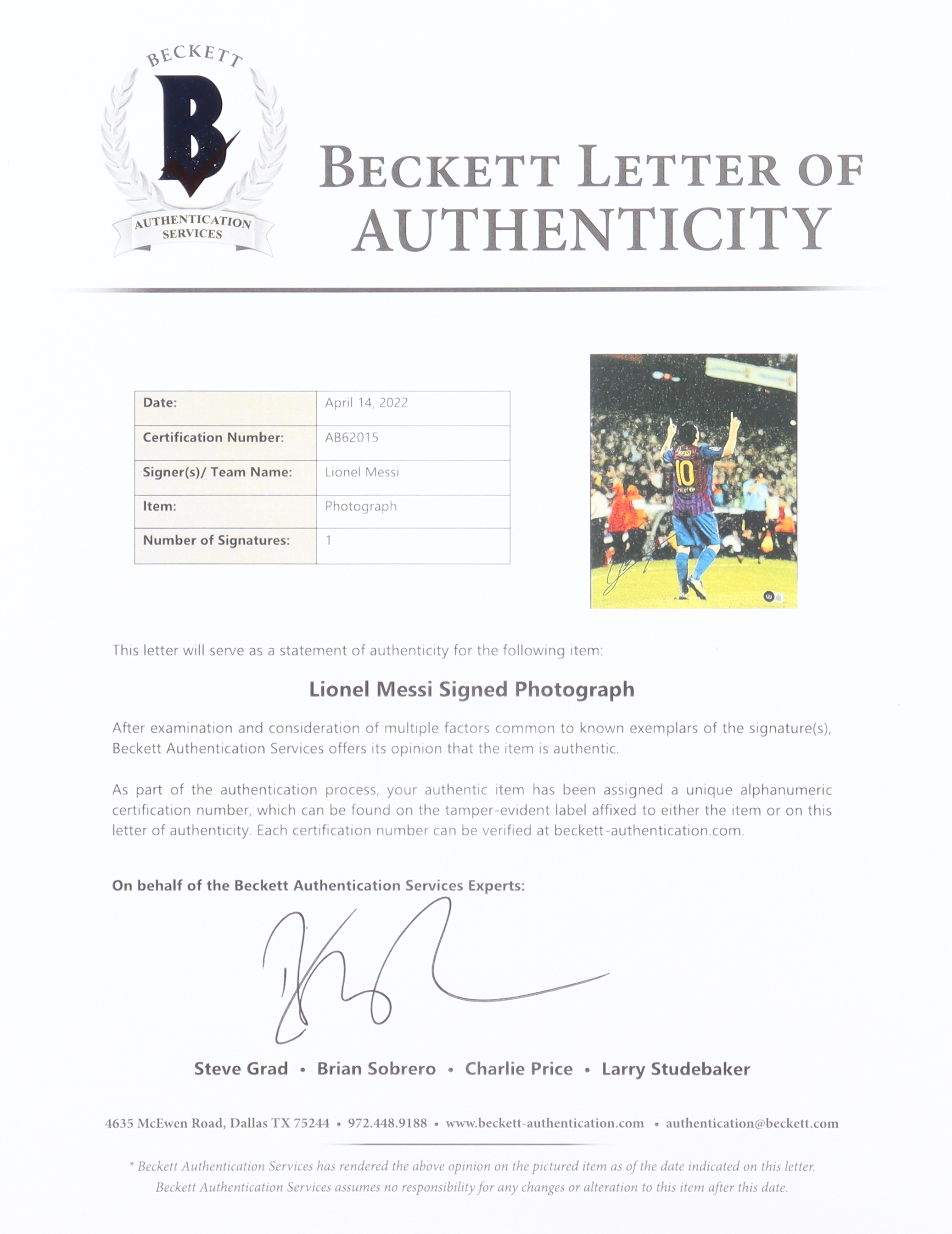 The autograph includes an official Beckett Authentication Services hologram and matching LOA for authenticity purposes.