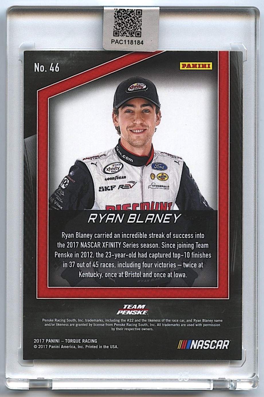 Ryan Blaney Signed 2017 Panini Torque #46 Gold (PA Encapsulated)