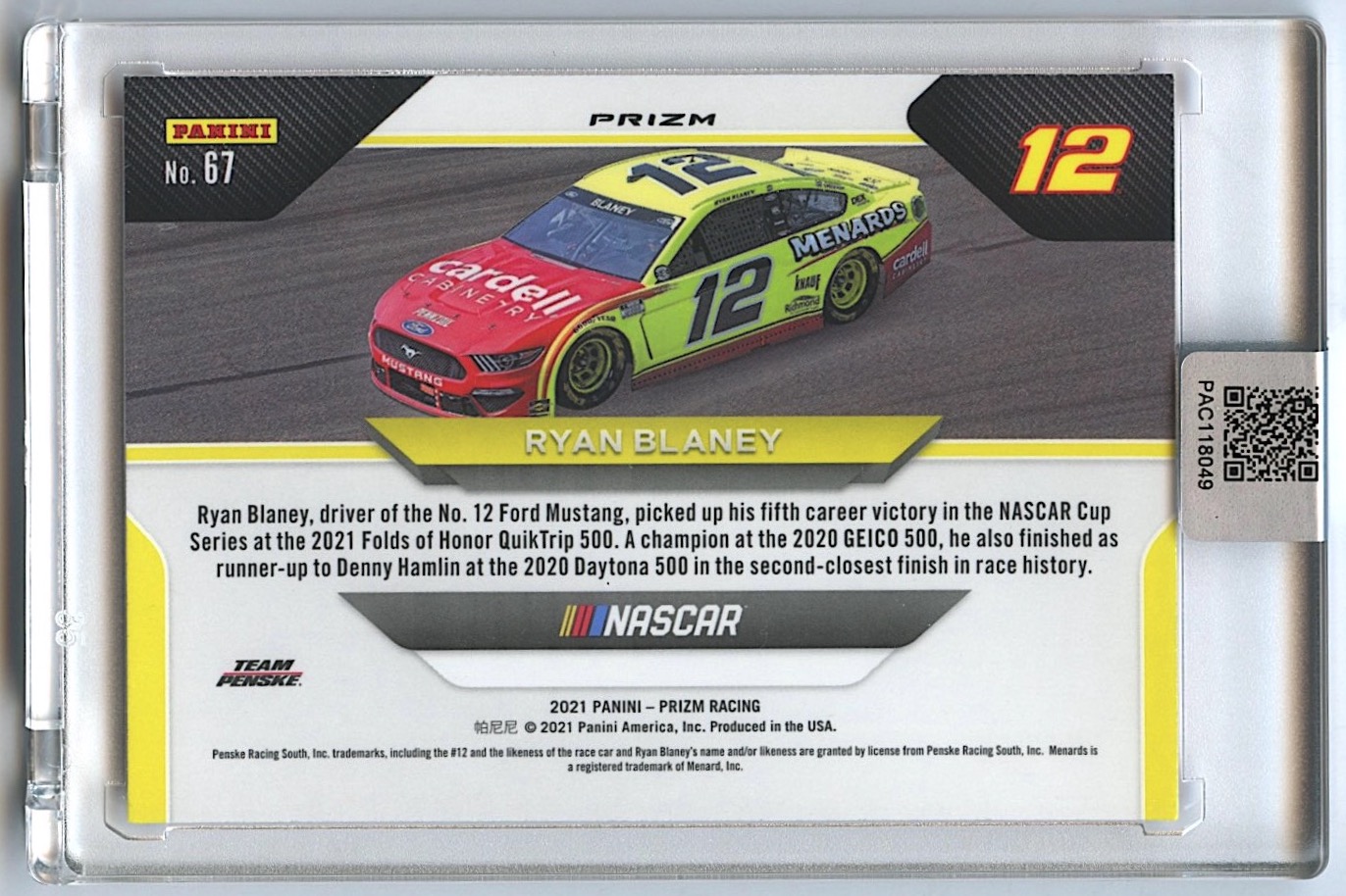 Ryan Blaney Signed 2021 Panini Prizm #67 Prizms Red (PA Encapsulated)