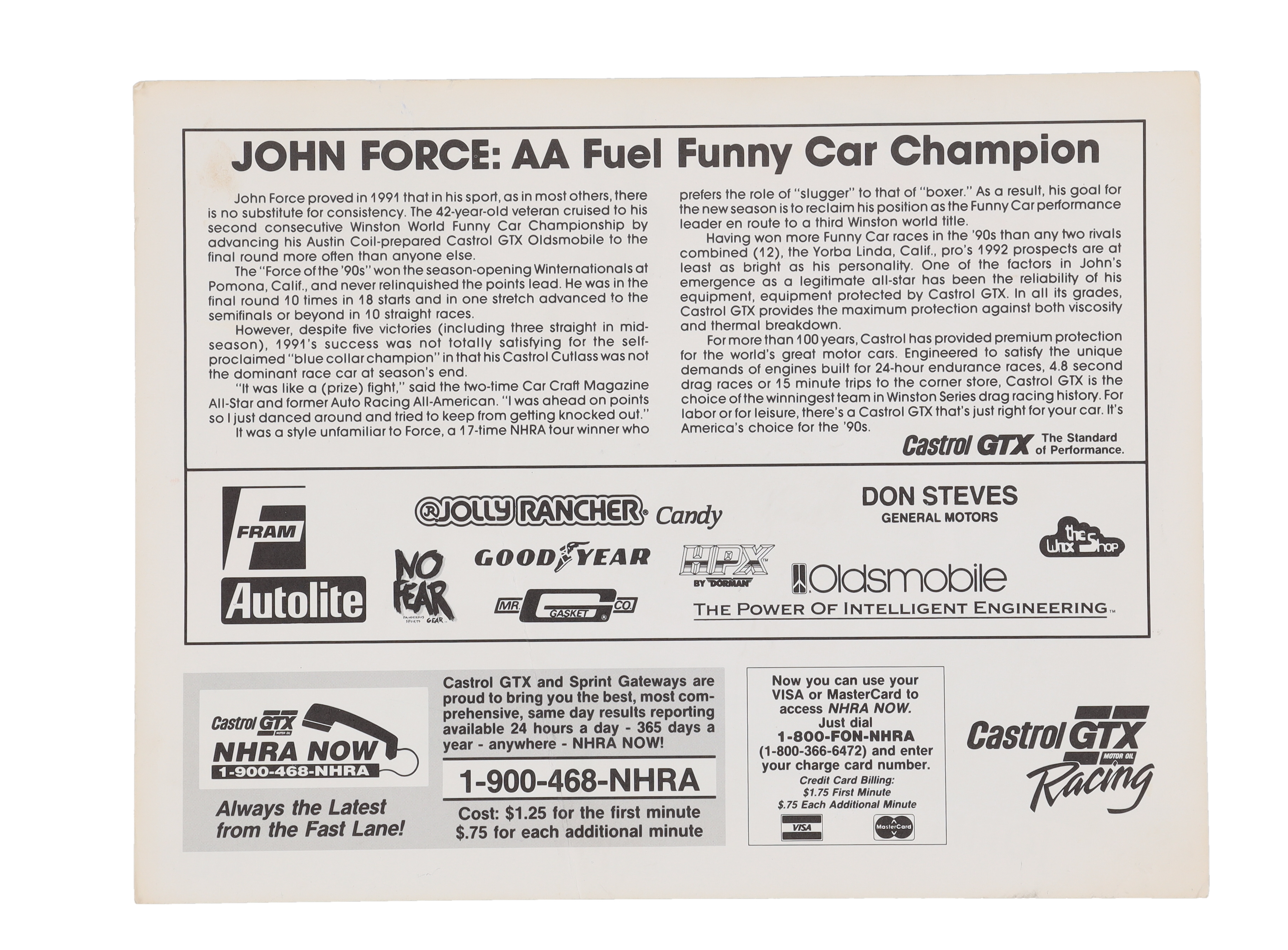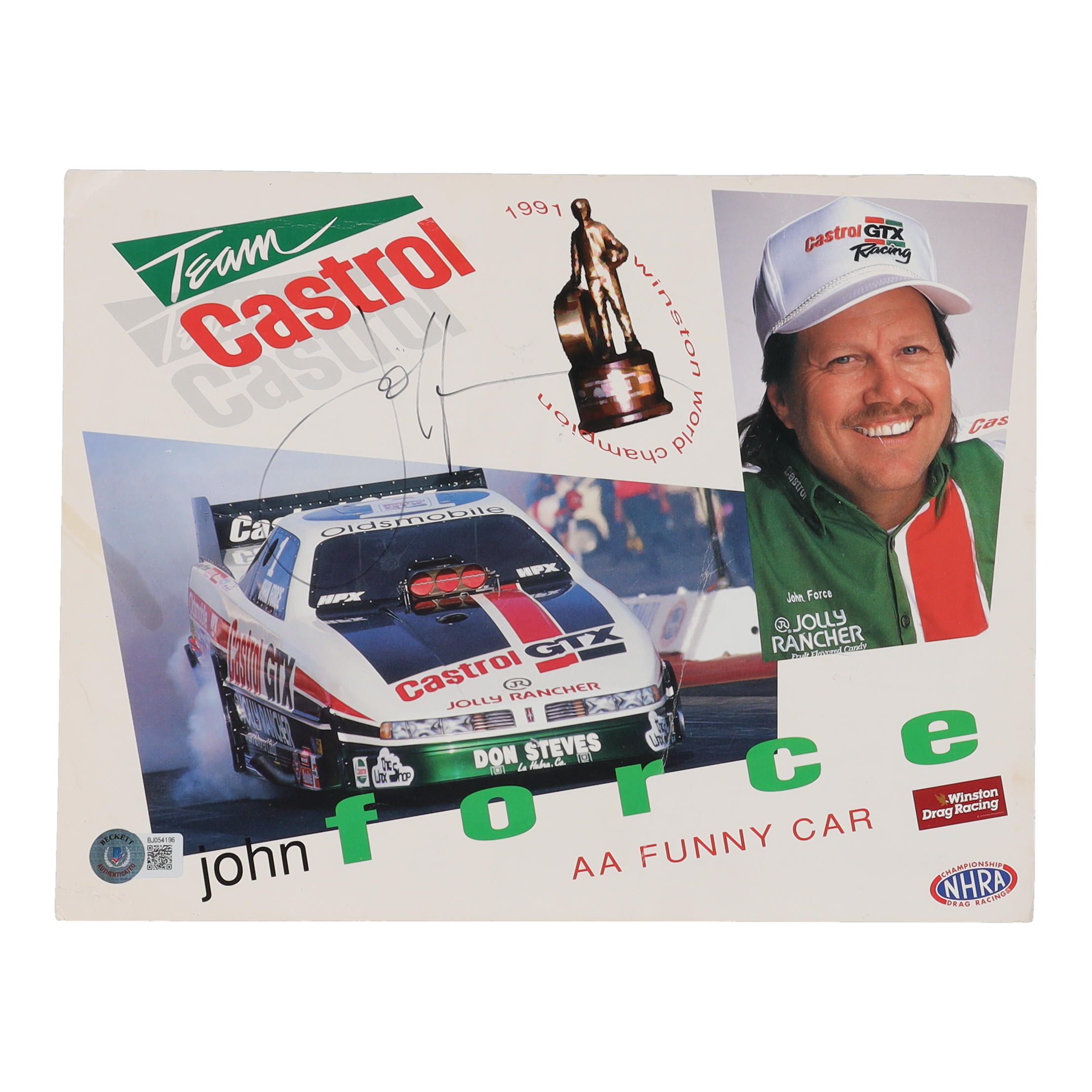 Photo measures 8" x 10" in size and has been hand-signed by John Force. Please note, the photo has minor staining and creasing throughout.
