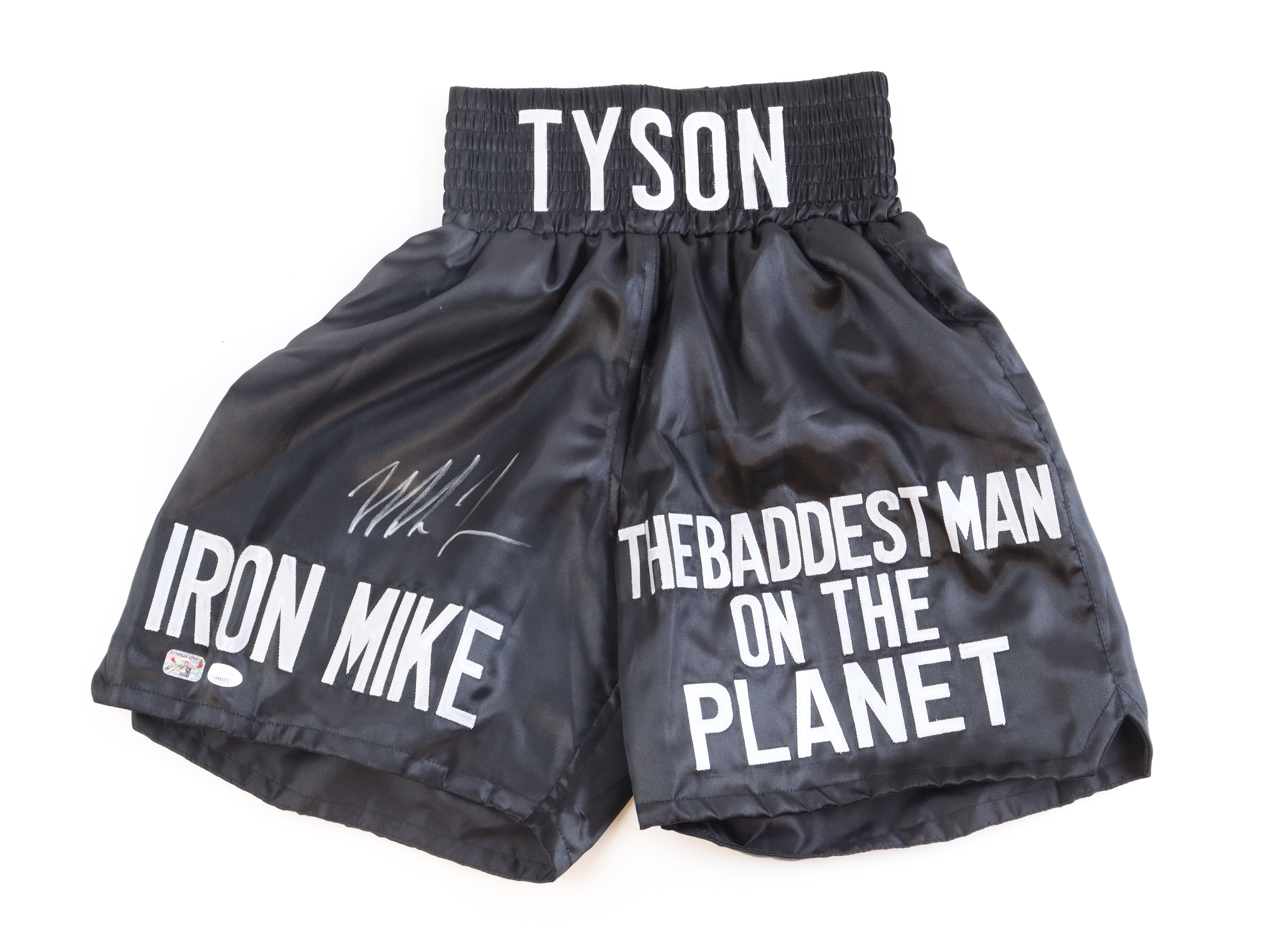 Custom boxing shorts, size XL. Hand-signed by Mike Tyson (HOF).