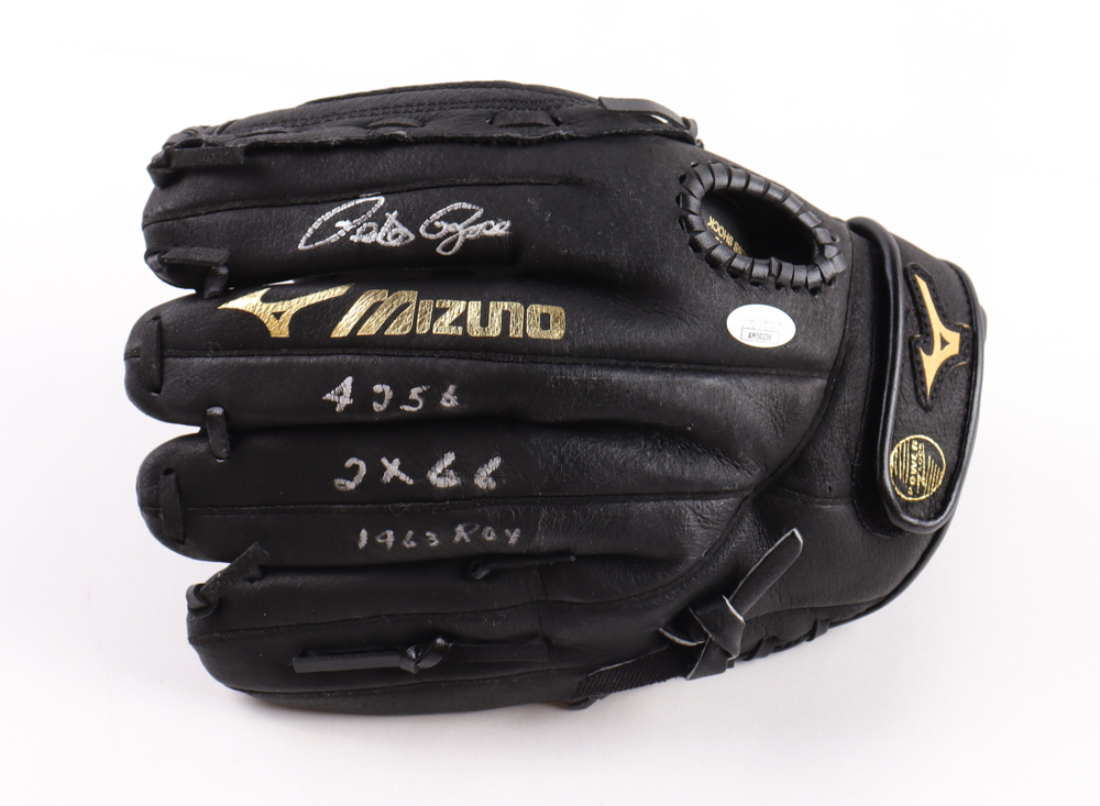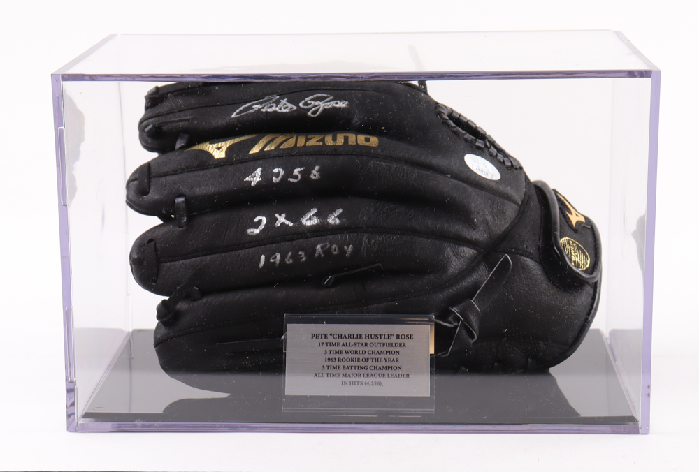 Pete Rose Signed Mizuno Baseball Glove with Display Case Inscribed "4256"." 2X GG" & "1963 ROY" (JSA)