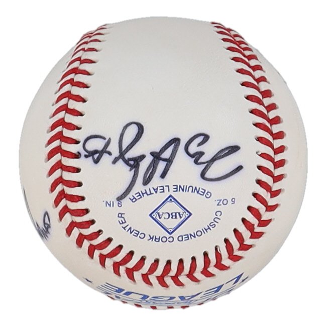 Rawlings Official League baseball has been hand-signed by Paul Thompson, Tracy Hidhes and Russell Brannon.