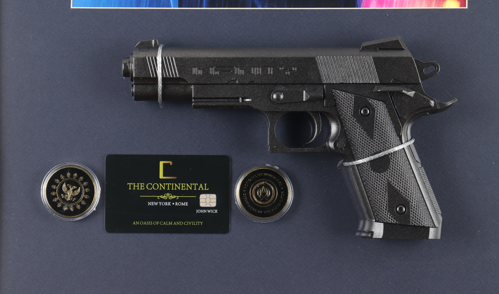 Custom frame measures approximately 17" x 29" in size. The display features a John Wick movie poster print as well as replica pistol, adjudicator coin and Continental Key Card. Please note, the display is unsigned.