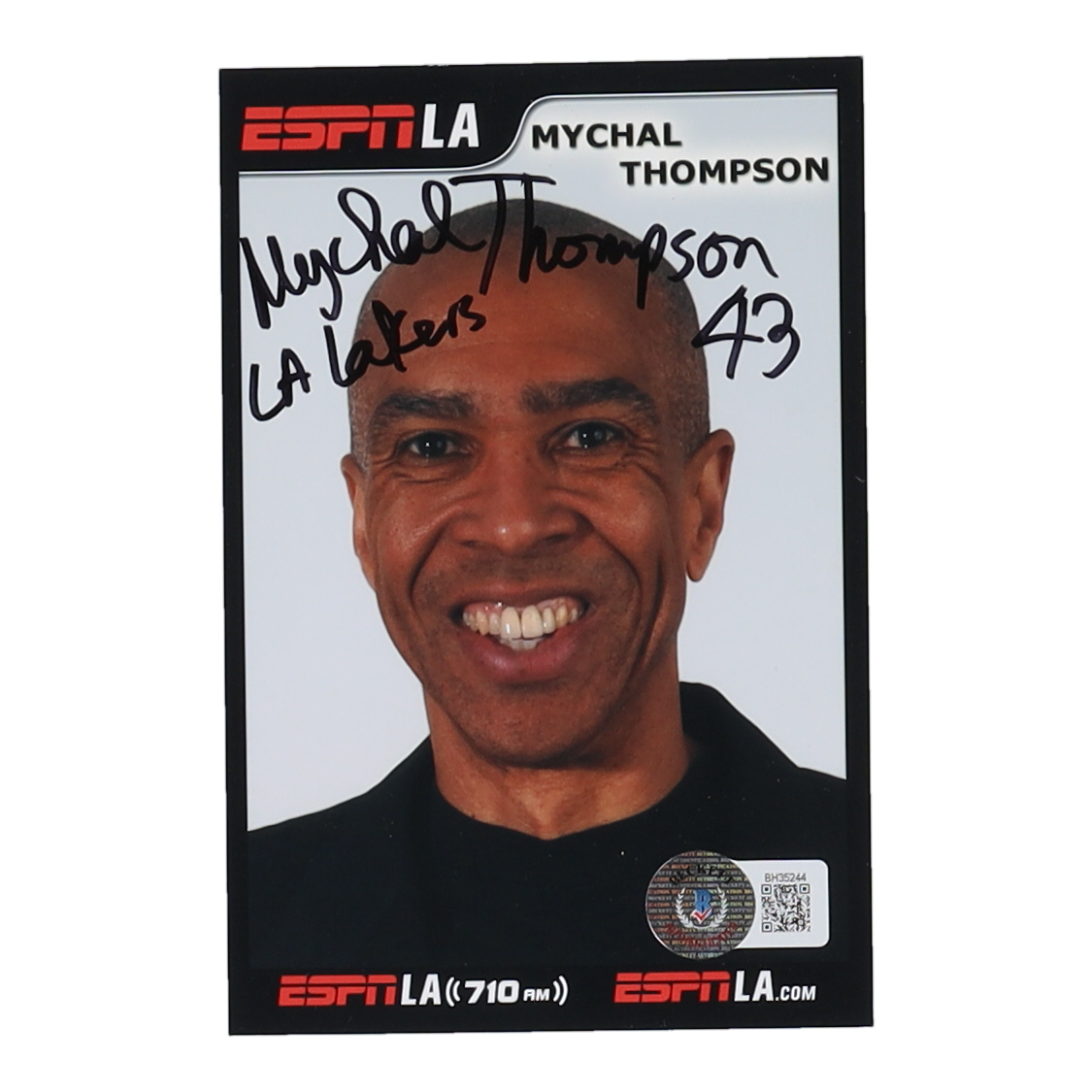 Photo measures approximately 4" x 6" in size and has been hand-signed and inscribed by Mychal Thompson (Los Angeles Lakers).